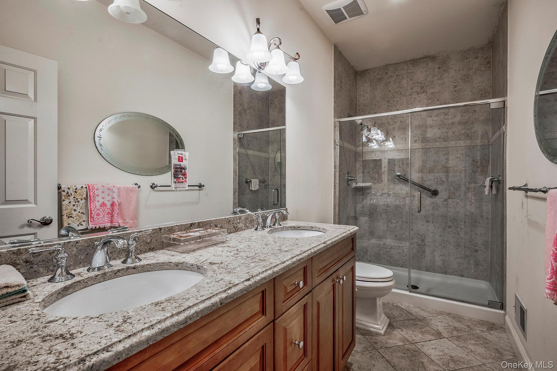 - Bathroom with double vanity, a stall shower, light tile patterned flooring, and a chandelier