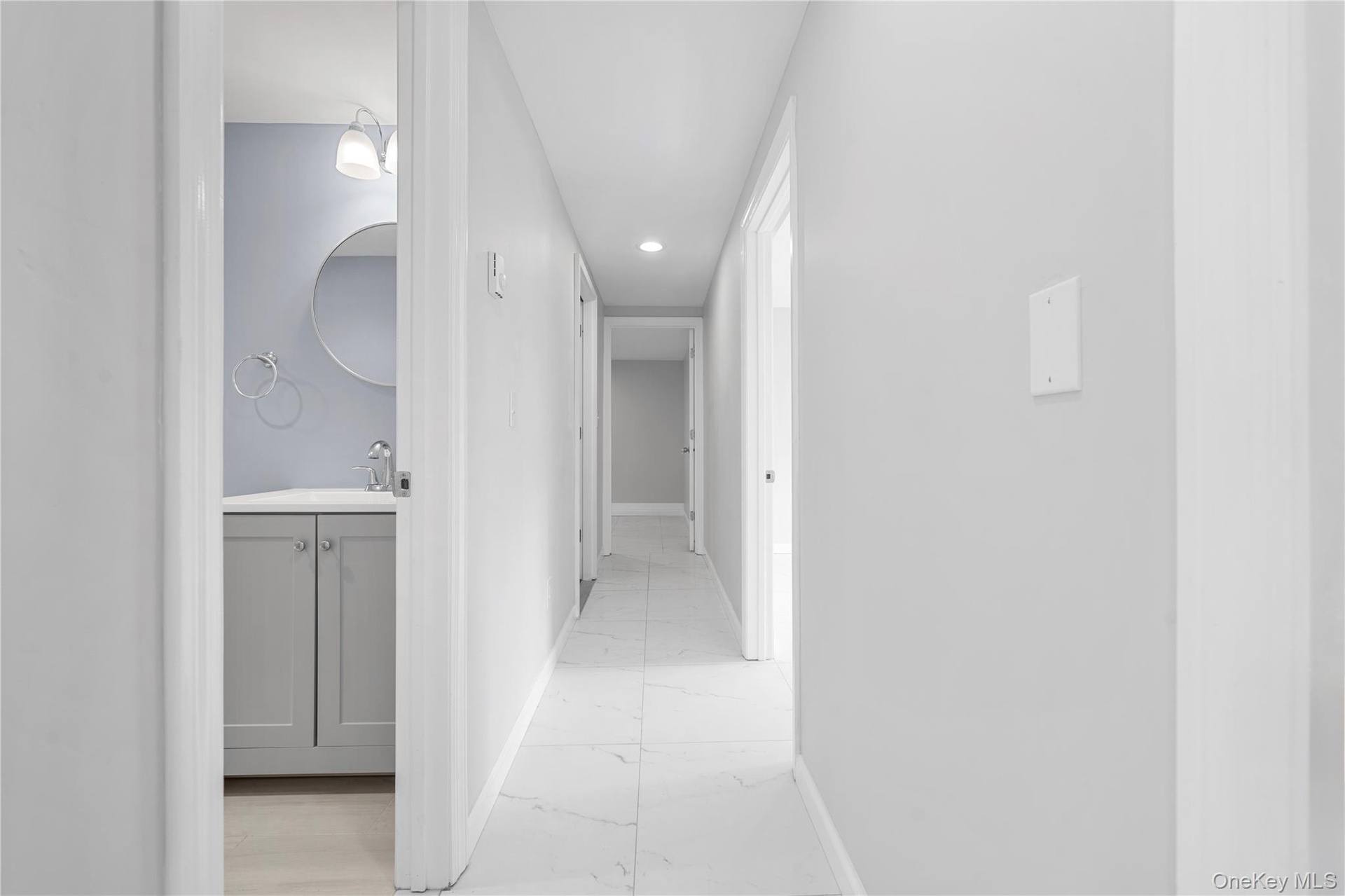 - Hallway featuring light marble finish floors and recessed lighting