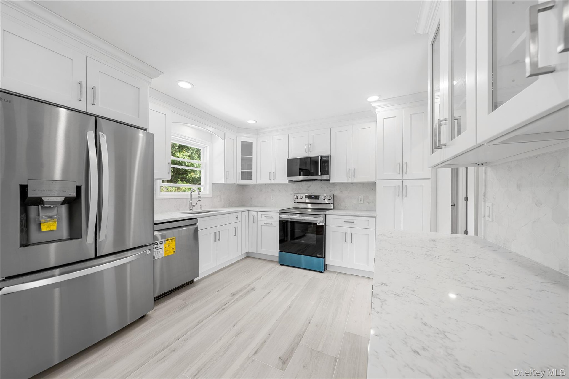 - Kitchen featuring light marble finish flooring, light countertops, decorative backsplash, white cabinetry, and recessed lighting