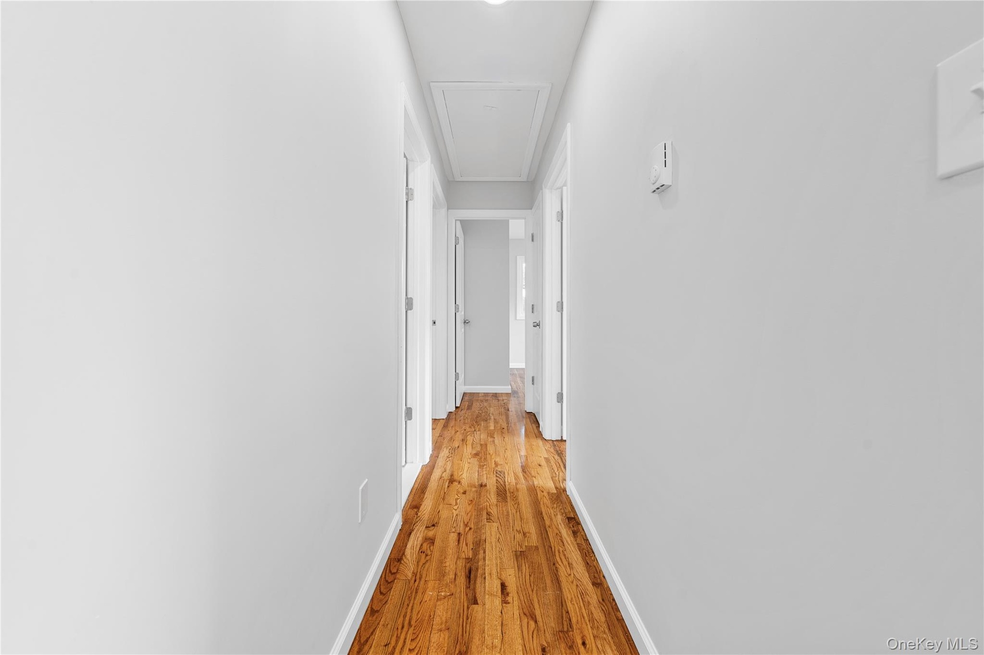 - Hall with light wood-type flooring and attic access