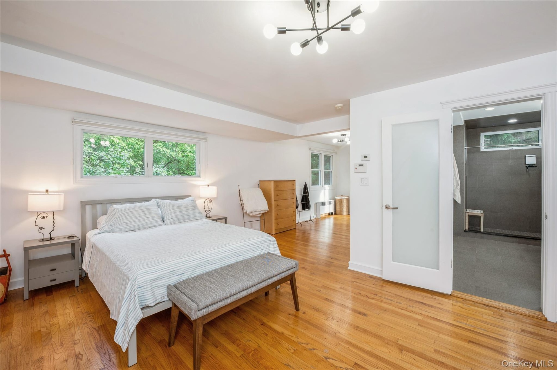 - En-suite Bedroom with hardwood flooring and a chandelier