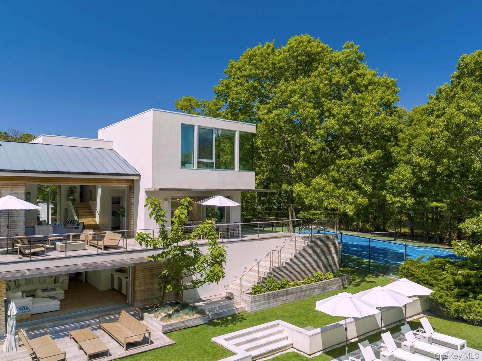 In a class by itself, New to Market, exquisite Malibu Style Modern Contemporary perfectly suited on a meticulously well-kept shy 2-acre parcel with Pool and Tennis offering the Ultimate in Hamptons Resort Style Summer living. Magnificently positioned and perched high above is where you'll find this exceptional Hamptons 4 level Modern bathing in full privacy and greenery with its commanding views of the full-sized North/South Tennis and its oversized 52x18 heated Saltwater Gunite Pool. Here summer never ends with its pool and jacuzzi wrapped in white marble and sprawling green lawns which take center stage all summer long. Boasting 6725 sqft of luxurious open and modern resort style living spaces on 4 levels which feature soaring ceiling heights, an abundance of natural light and its expansive sliding glass doors which magically blend the indoor and outdoor spaces effortlessly creating the ultimate Hamptons entertaining space. Guests of all ages will enjoy the well-appointed 4 Guest ensuite beds found on 2 private levels plus the additional private Owners Suite which occupies the entire 3rd floor, complete with Resort Style Spa bath and breathtaking views. For the discerning Chef, a fully outfitted Chefs Kitchen with its professional high-end stainless-steel appliances and large center island sit ready and waiting to deliver the ultimate dining experience while enjoying marvelous Tennis and Poolside views. A whole range of amenities are available on level 1 that enliven this unequaled Hamptons Summer Getaway, which include a Cinema room, Fitness center, sprawling lounge and its well-furnished wet bar. While serenity enwraps this captivating Hamptons retreat, it lies in superbly convenient proximity to world renowned Sag Harbor, Bridgehampton and Southampton shopping districts and its beloved Ocean Beaches.,