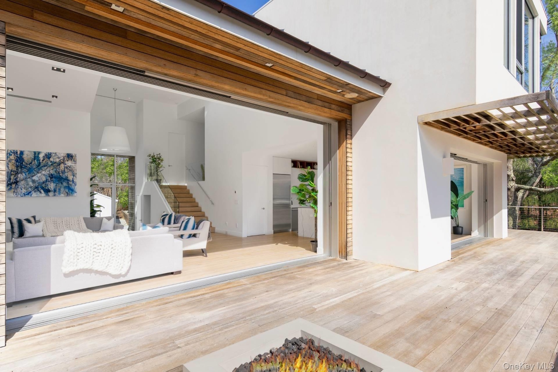 - Wooden terrace with an outdoor living space with a fire pit and views of pool and max privacy