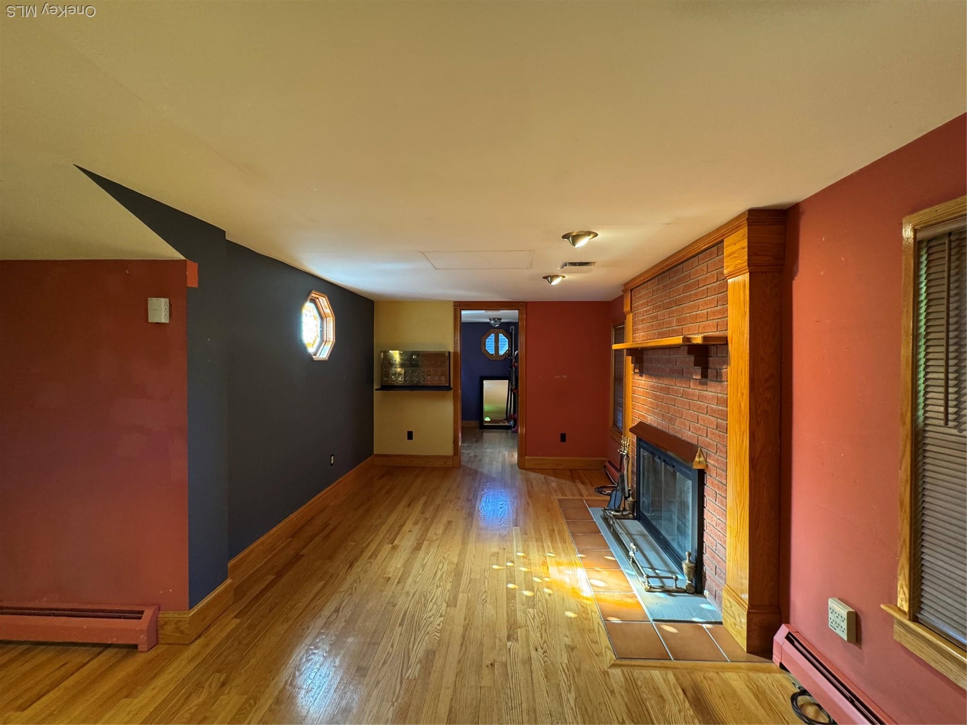 - Unfurnished living room featuring a baseboard radiator, a fireplace, and wood finished floors