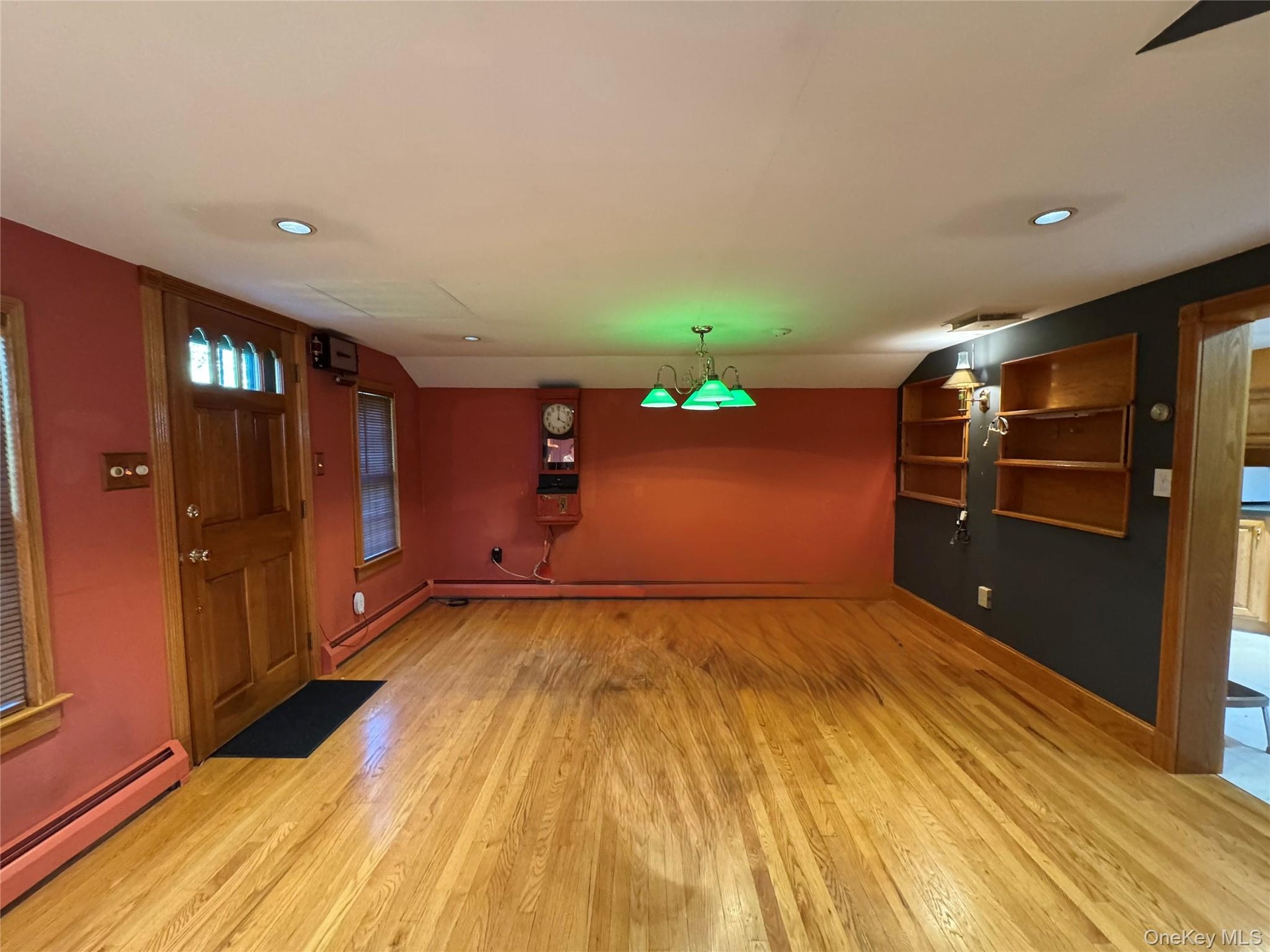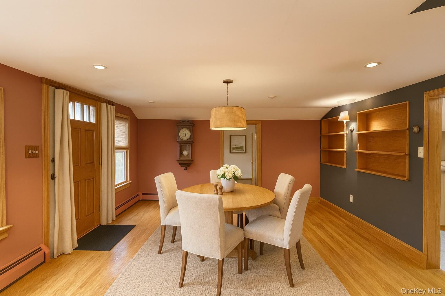 - Virtually staged Dining room with a baseboard radiator, recessed lighting, and light wood-type flooring