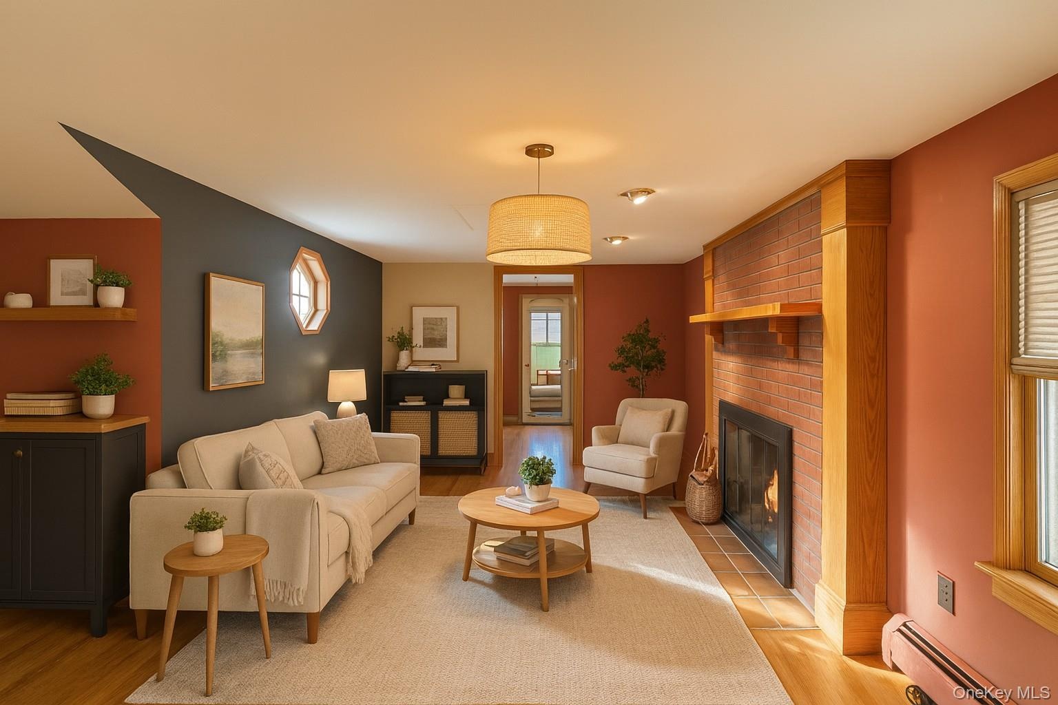 - Virtually staged Living area featuring a baseboard heating unit, a fireplace, and light wood-type flooring