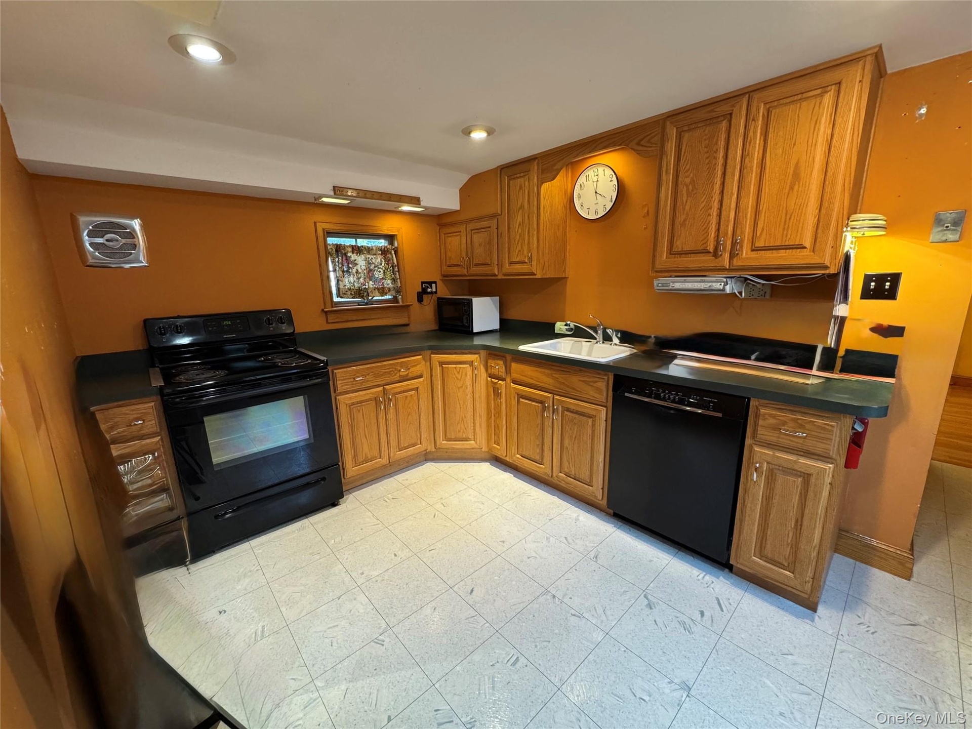 - Kitchen with brown cabinetry, black appliances, and dark countertops