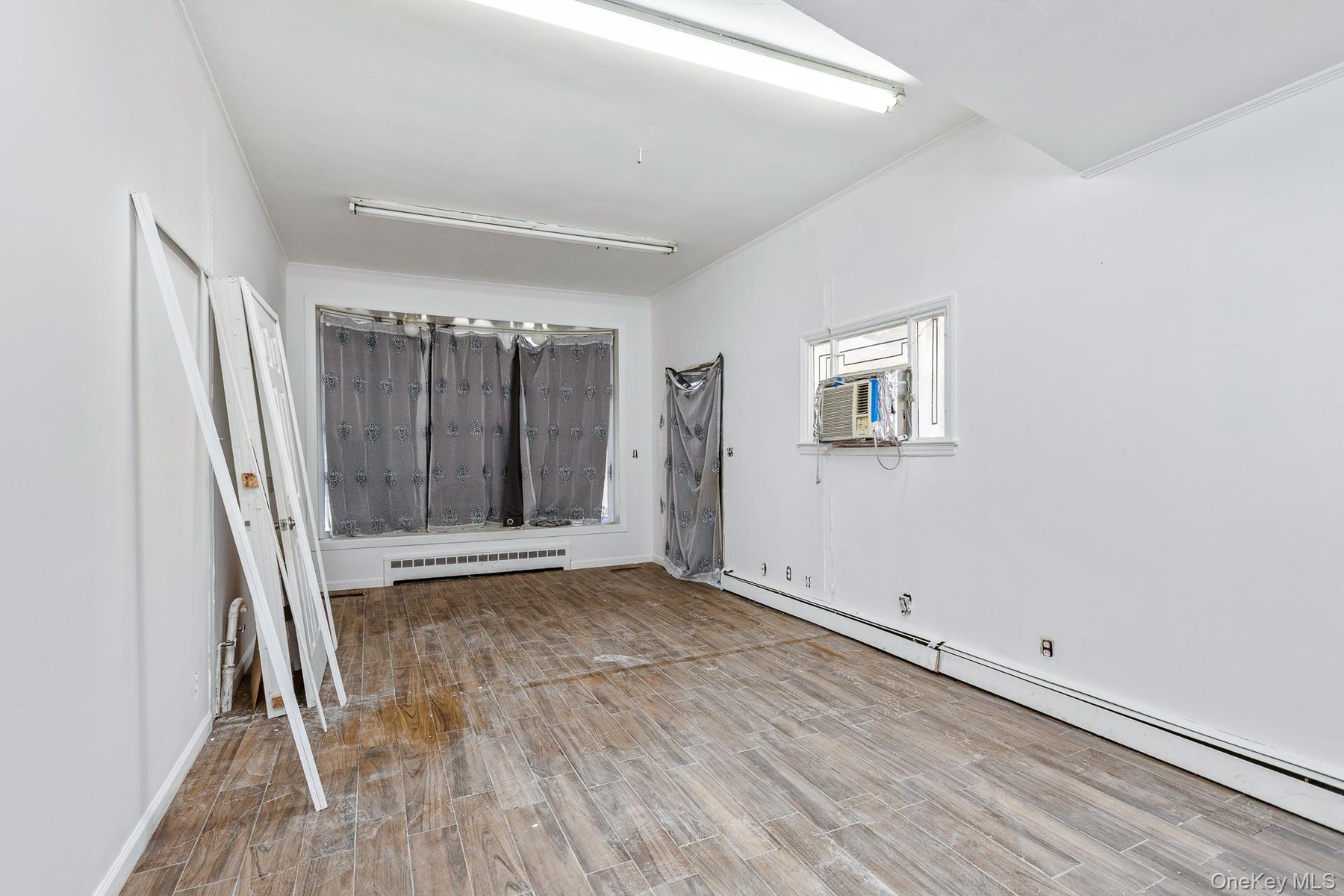- Empty room featuring wood finished floors, crown molding, and a baseboard heating unit