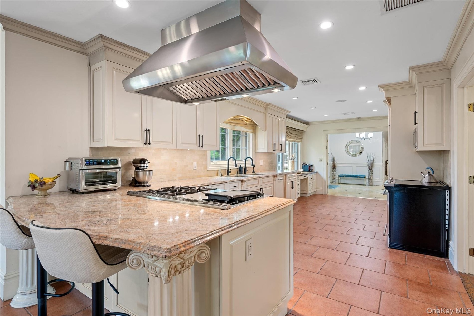 - Kitchen with a breakfast bar, island exhaust hood, tasteful backsplash, light stone counters, and recessed lighting