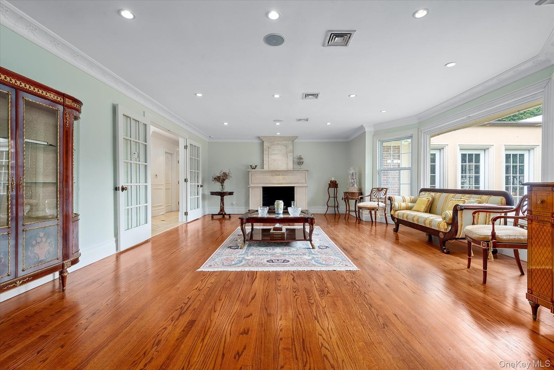 - Living room featuring crown molding, recessed lighting, light wood finished floors, a large fireplace, and french doors