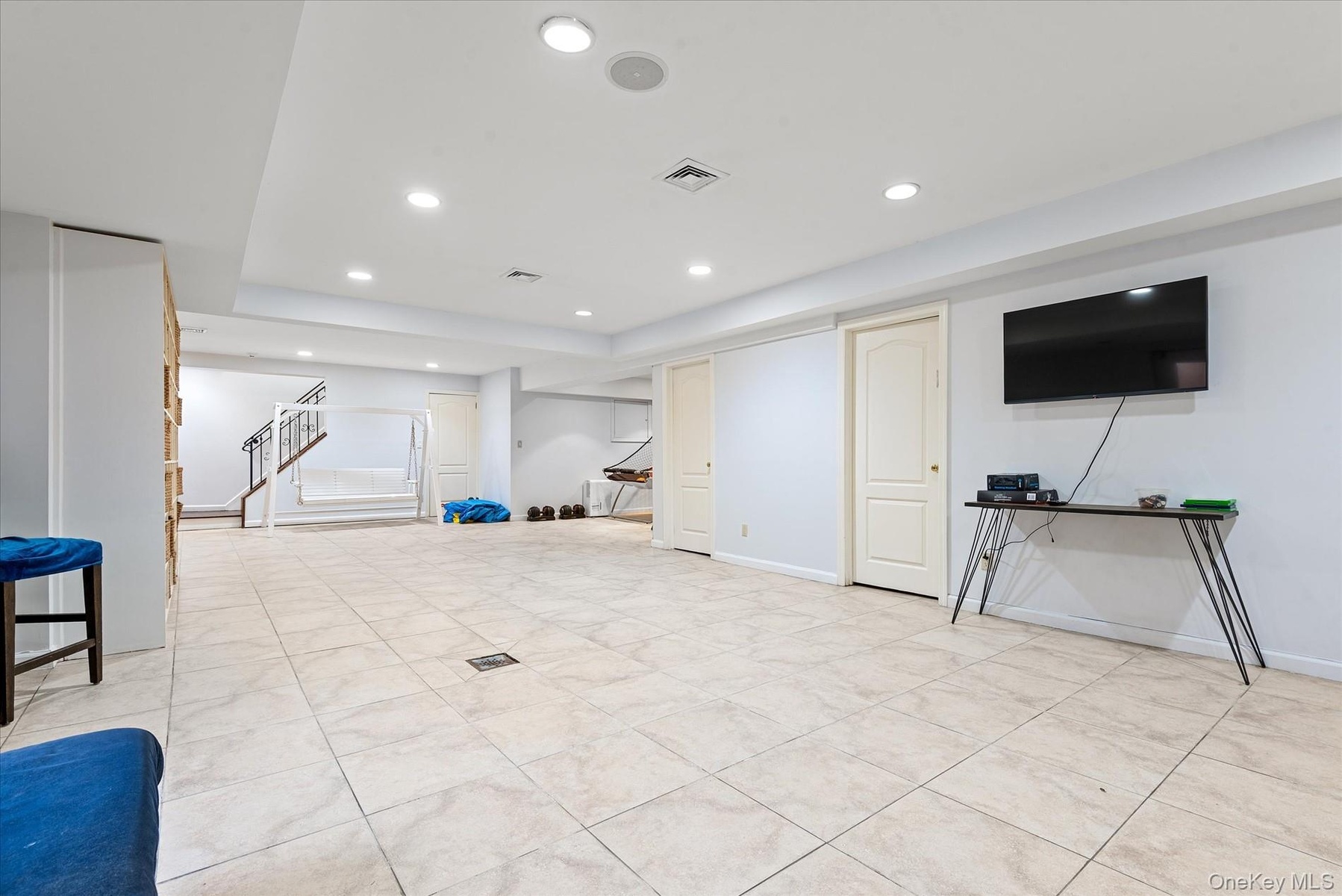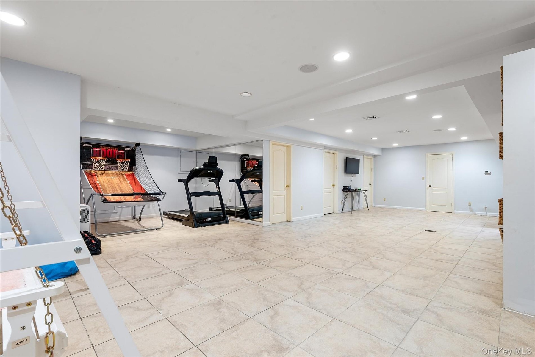 - Workout room with recessed lighting and light tile patterned flooring