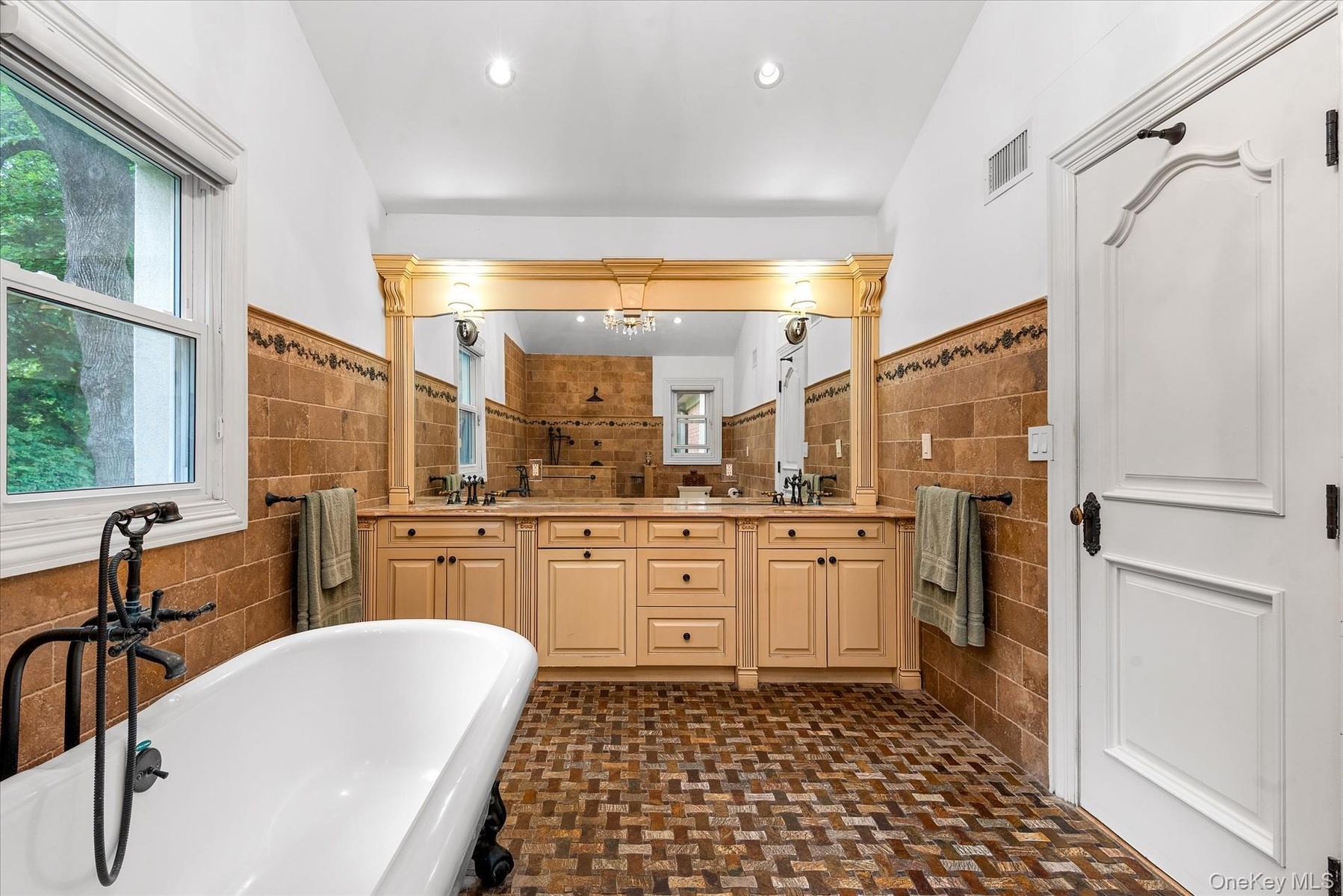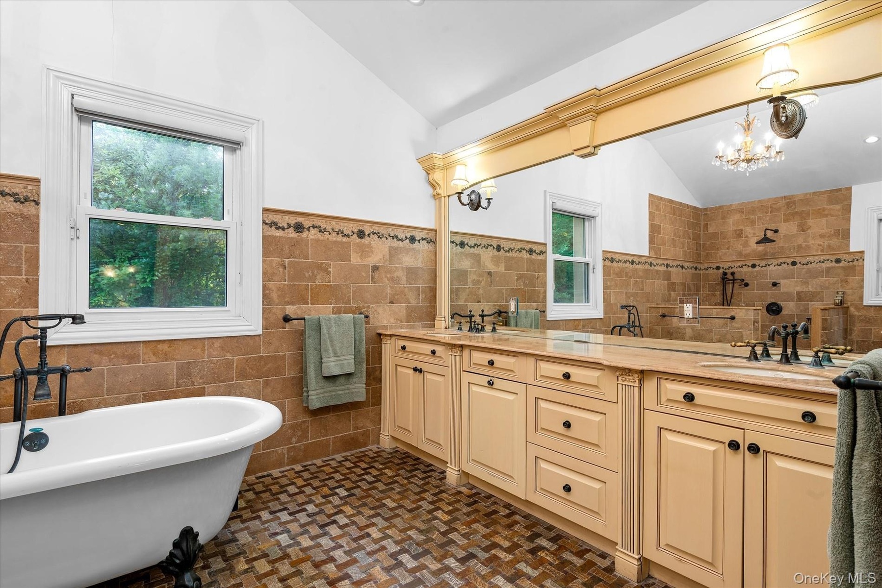 - Full bathroom with tile walls, a wainscoted wall, double vanity, a soaking tub, and a stall shower