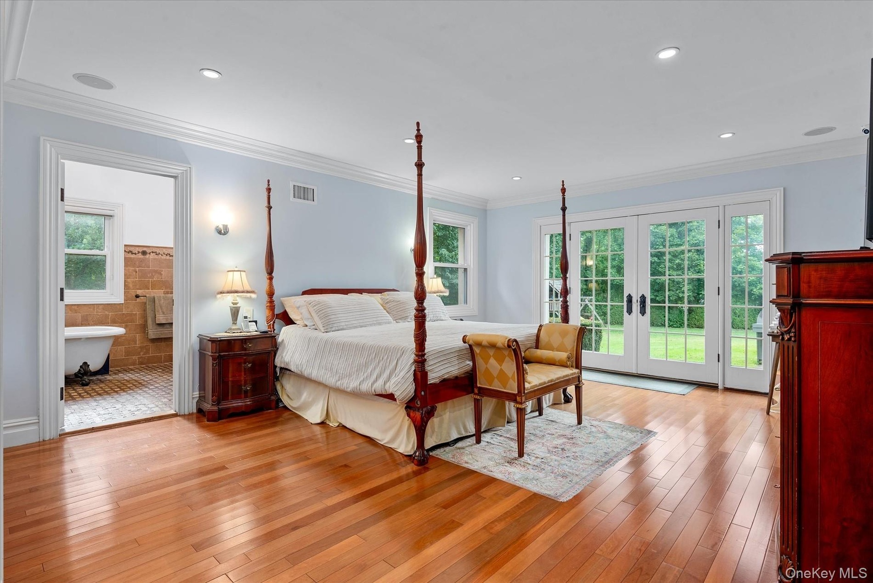 - Bedroom with french doors, crown molding, light wood-type flooring, access to exterior, and ensuite bath