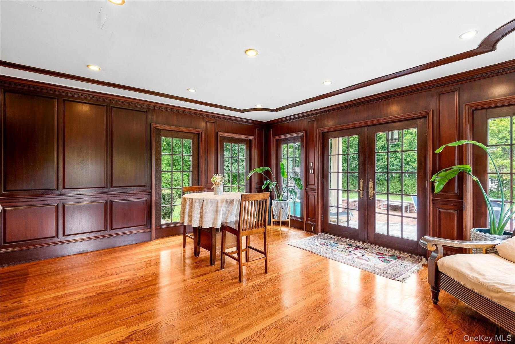 - Dining area featuring ornamental molding, light wood finished floors, french doors, recessed lighting, and plenty of natural light