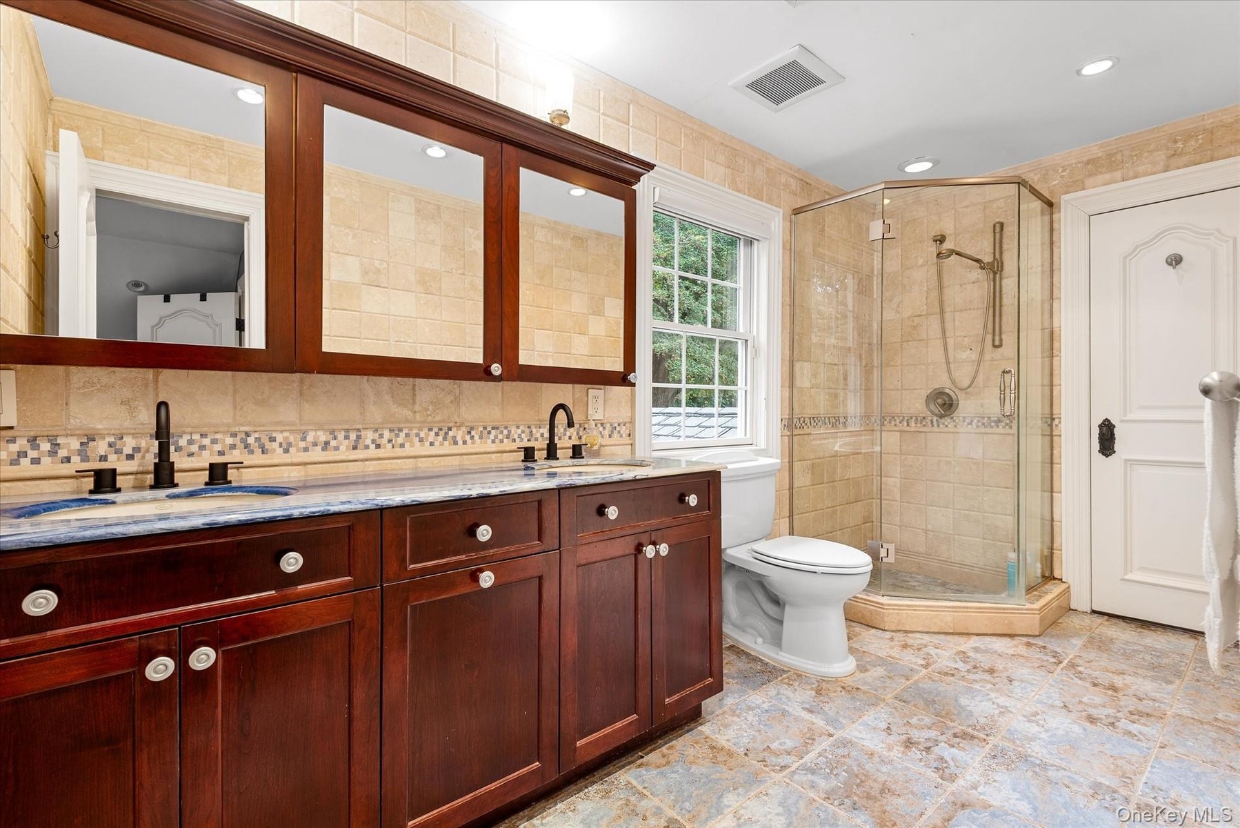 - Full bath featuring a stall shower, double vanity, tasteful backsplash, recessed lighting, and light stone finish flooring