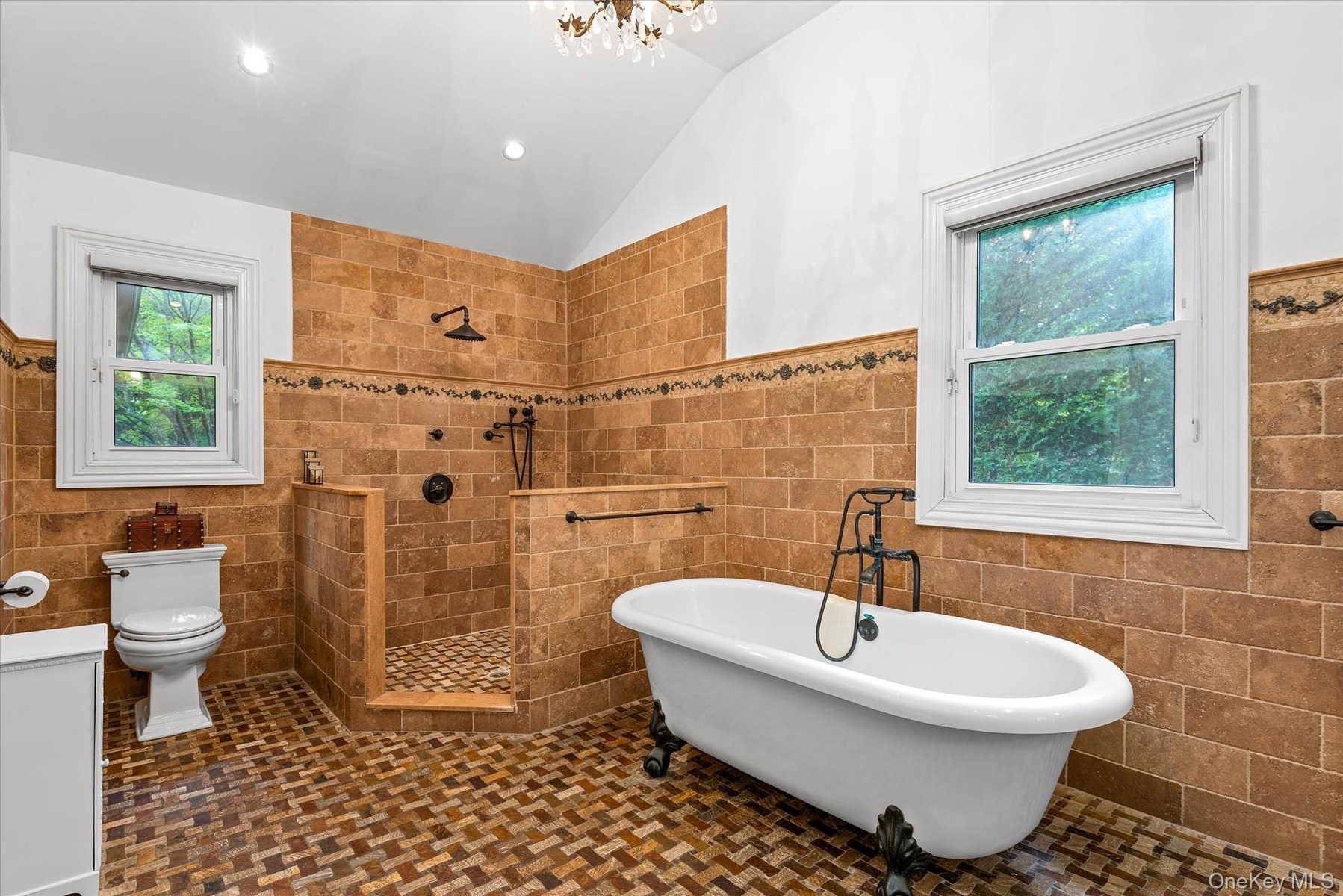 - Full bath with vaulted ceiling, double vanity, tile walls, a walk in shower, and a freestanding tub