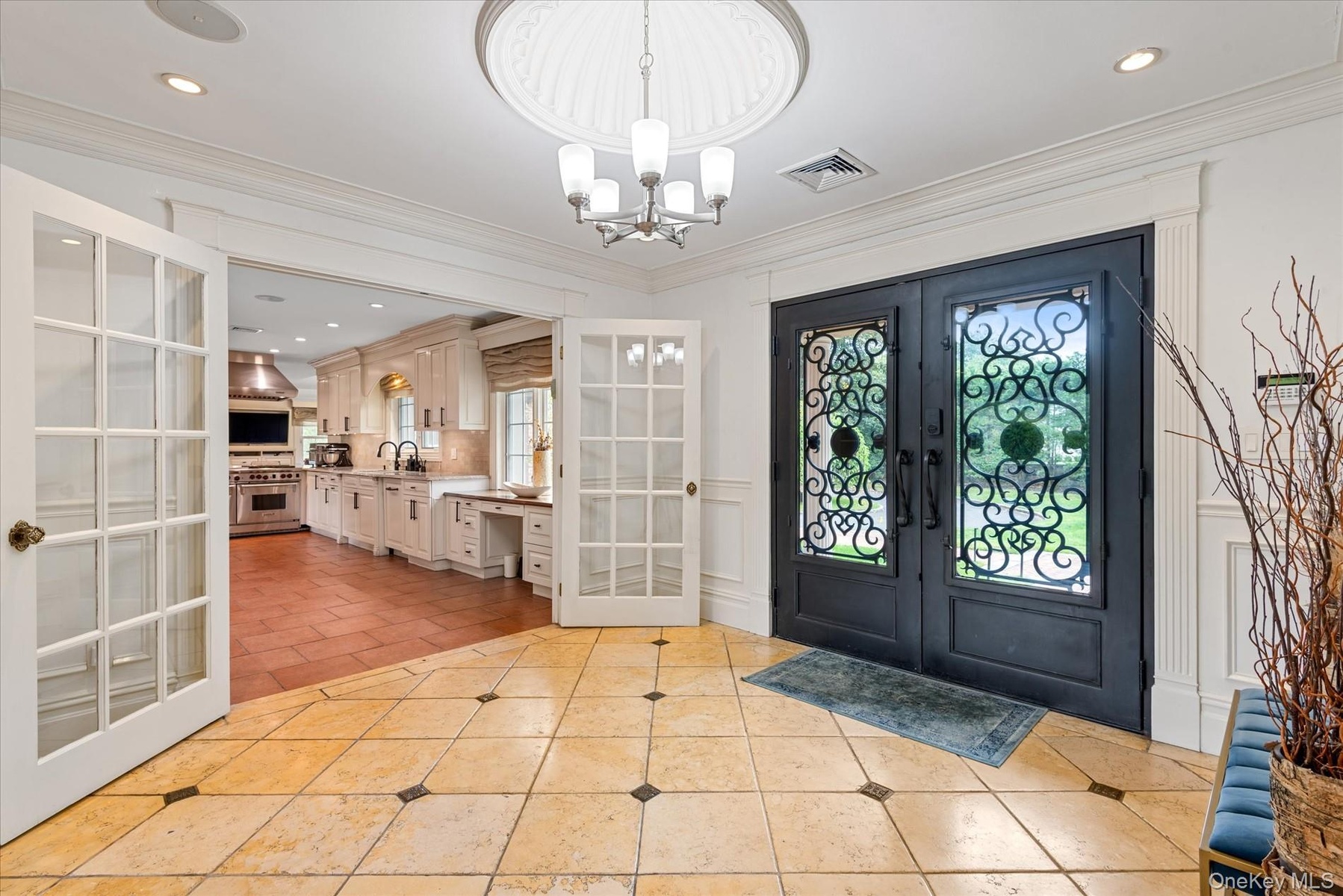 - Foyer entrance with french doors, recessed lighting, light tile patterned floors, ornamental molding, and a chandelier