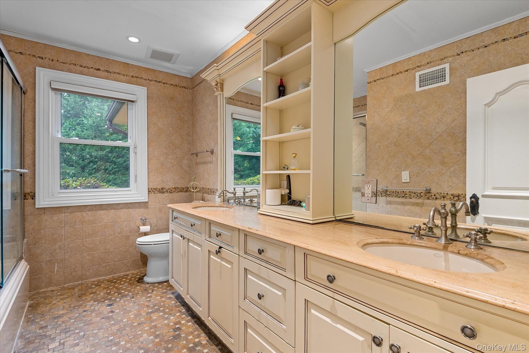 - Full bathroom with tile walls, plenty of natural light, double vanity, ornamental molding, and tile patterned flooring
