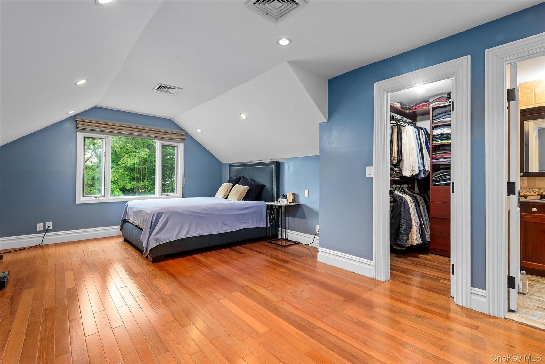 - Bedroom featuring light wood finished floors, a spacious closet, ensuite bath, lofted ceiling, and recessed lighting