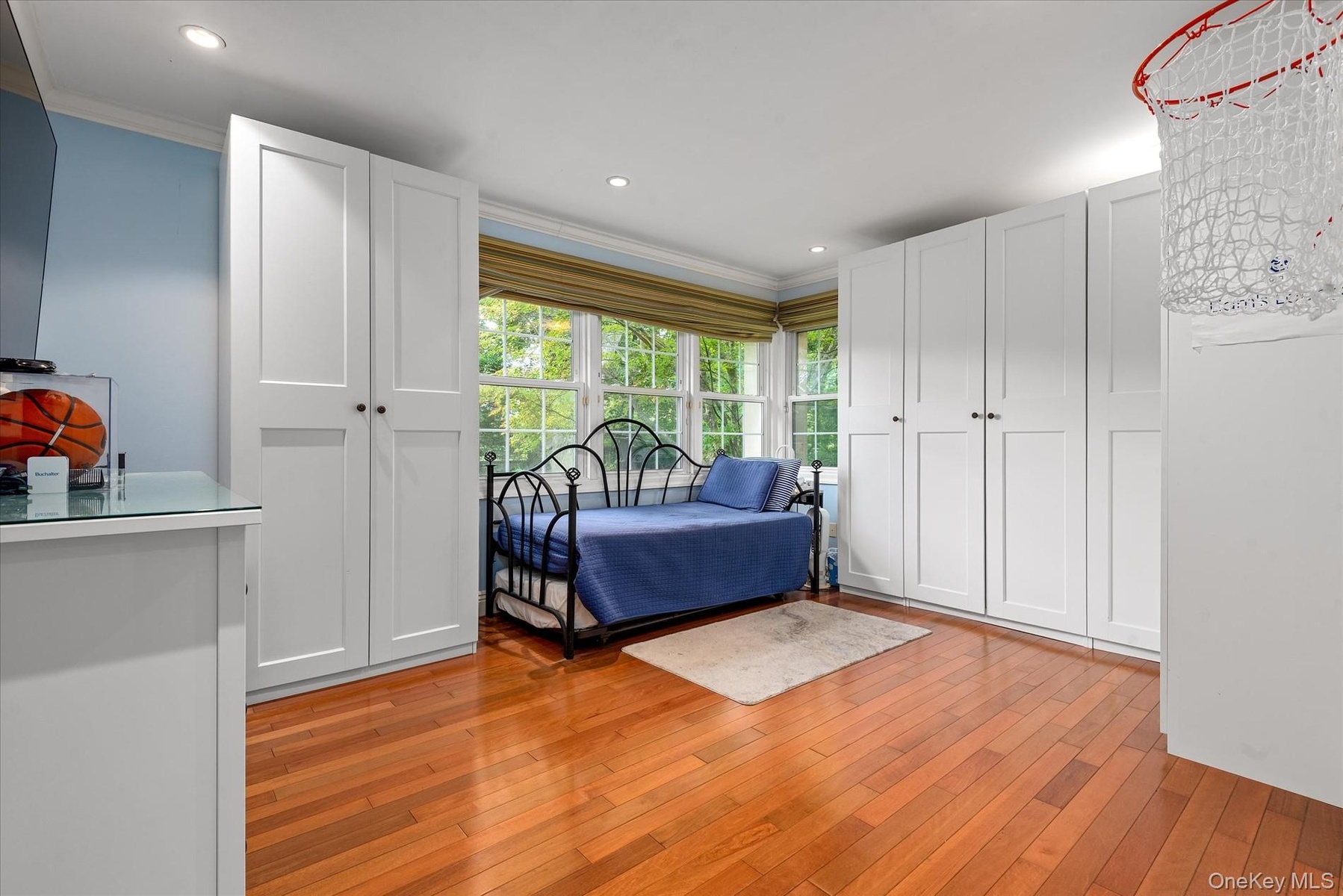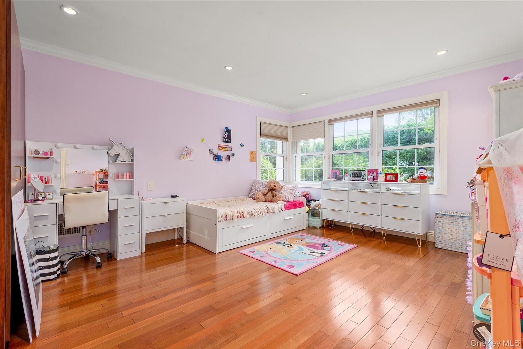 - Bedroom with ornamental molding, light wood-style flooring, a desk, and recessed lighting