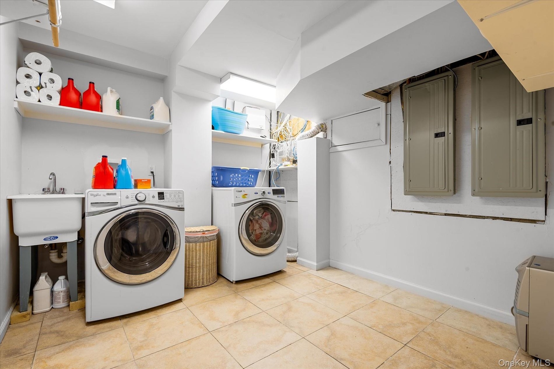 - Laundry area featuring independent washer and dryer, electric panel, and light tile patterned floors