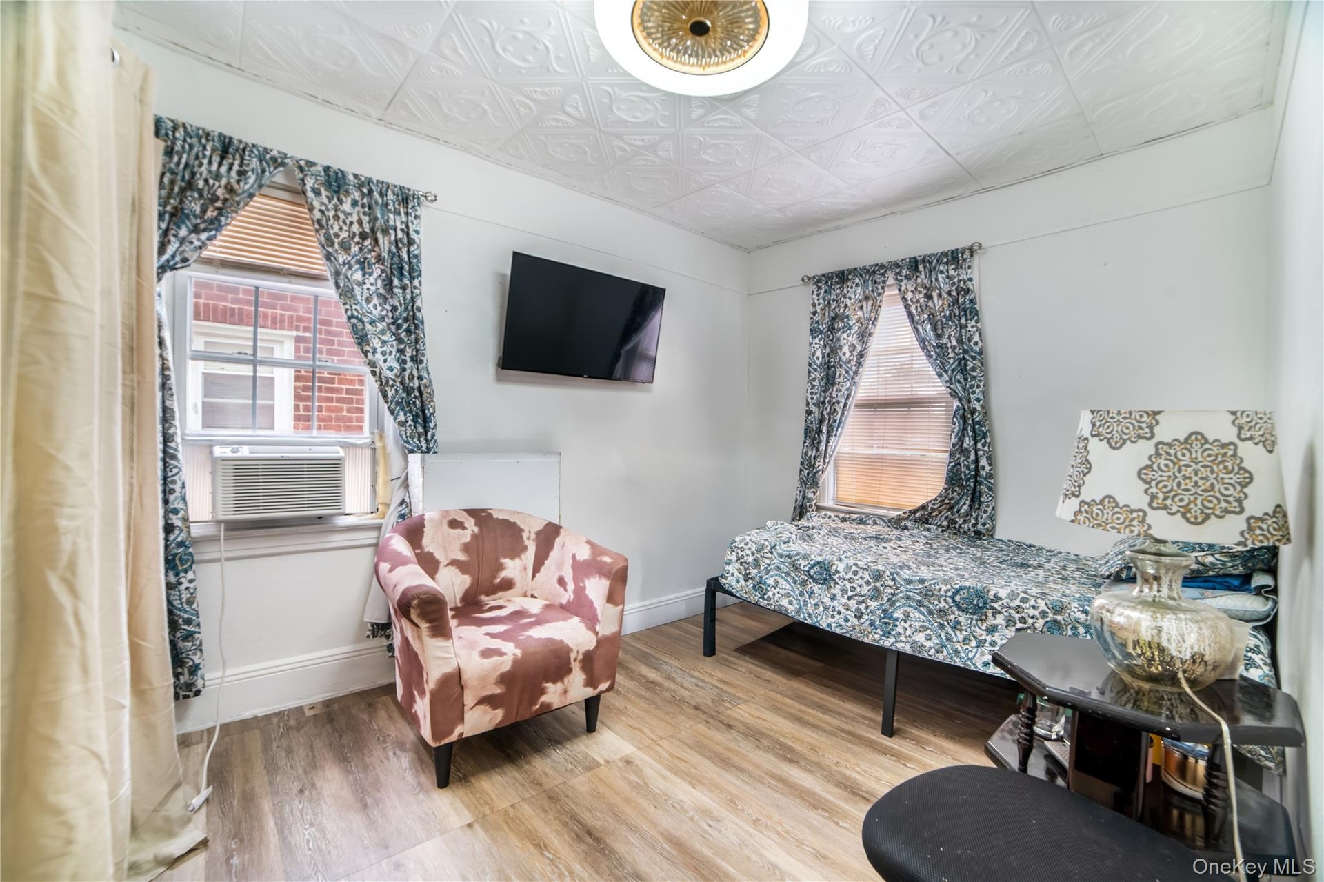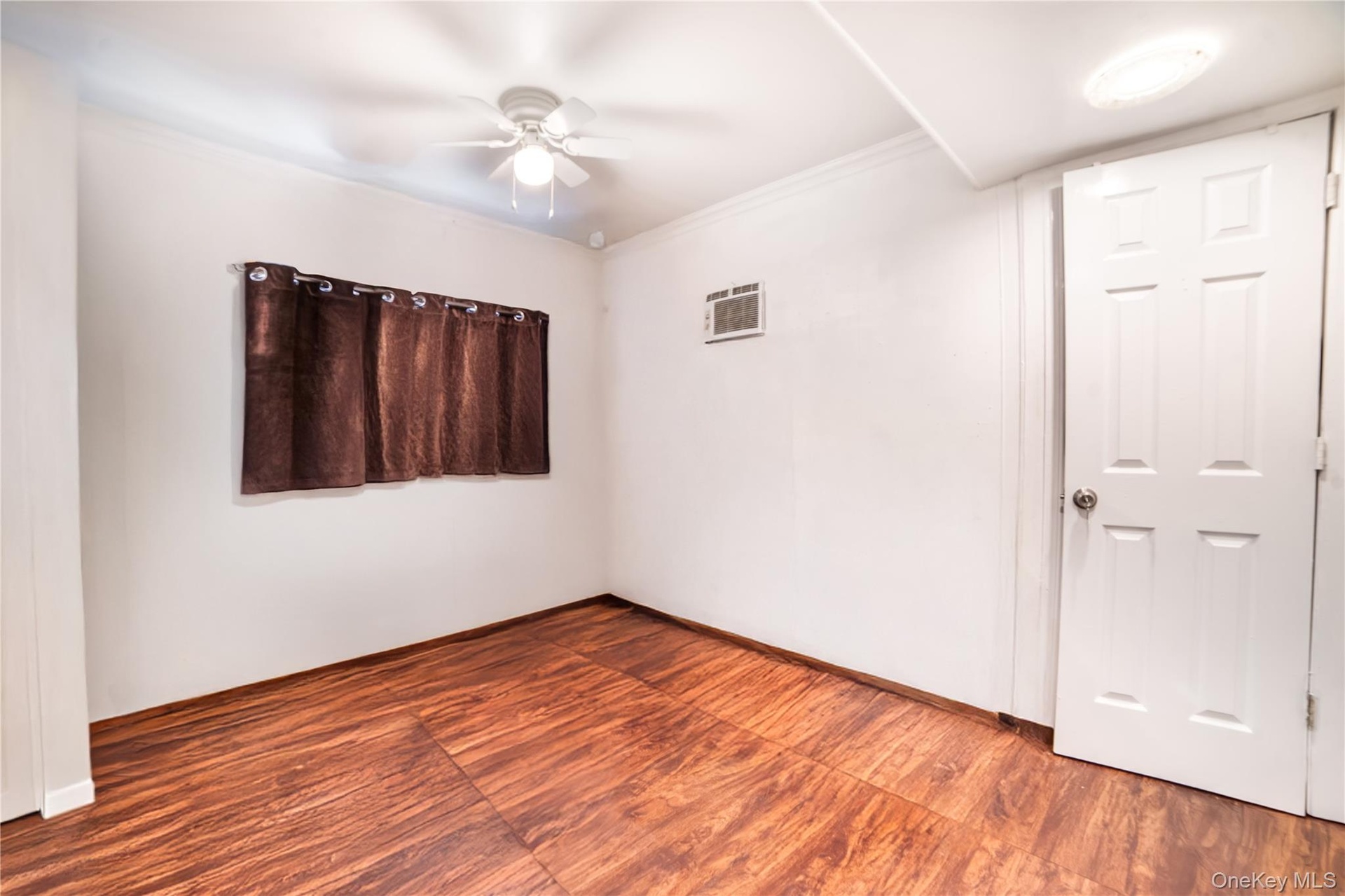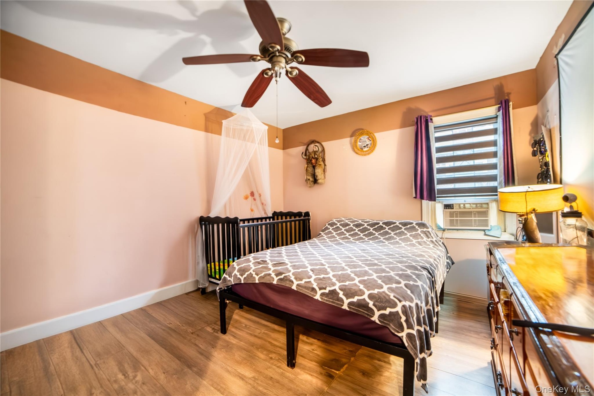 - Bedroom with wood finished floors, a ceiling fan, and cooling unit