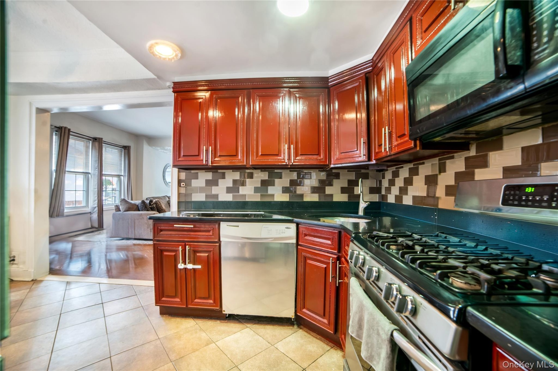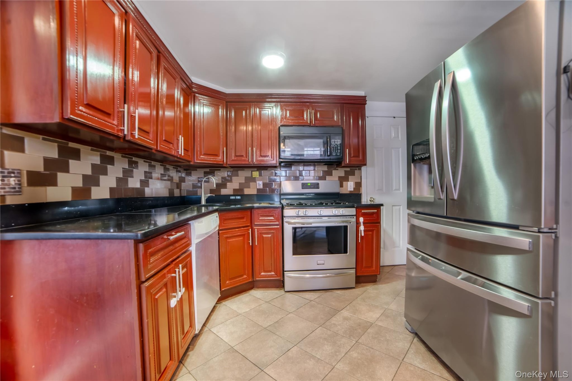 - Kitchen featuring stainless steel appliances, backsplash, light tile patterned floors, and dark brown cabinets