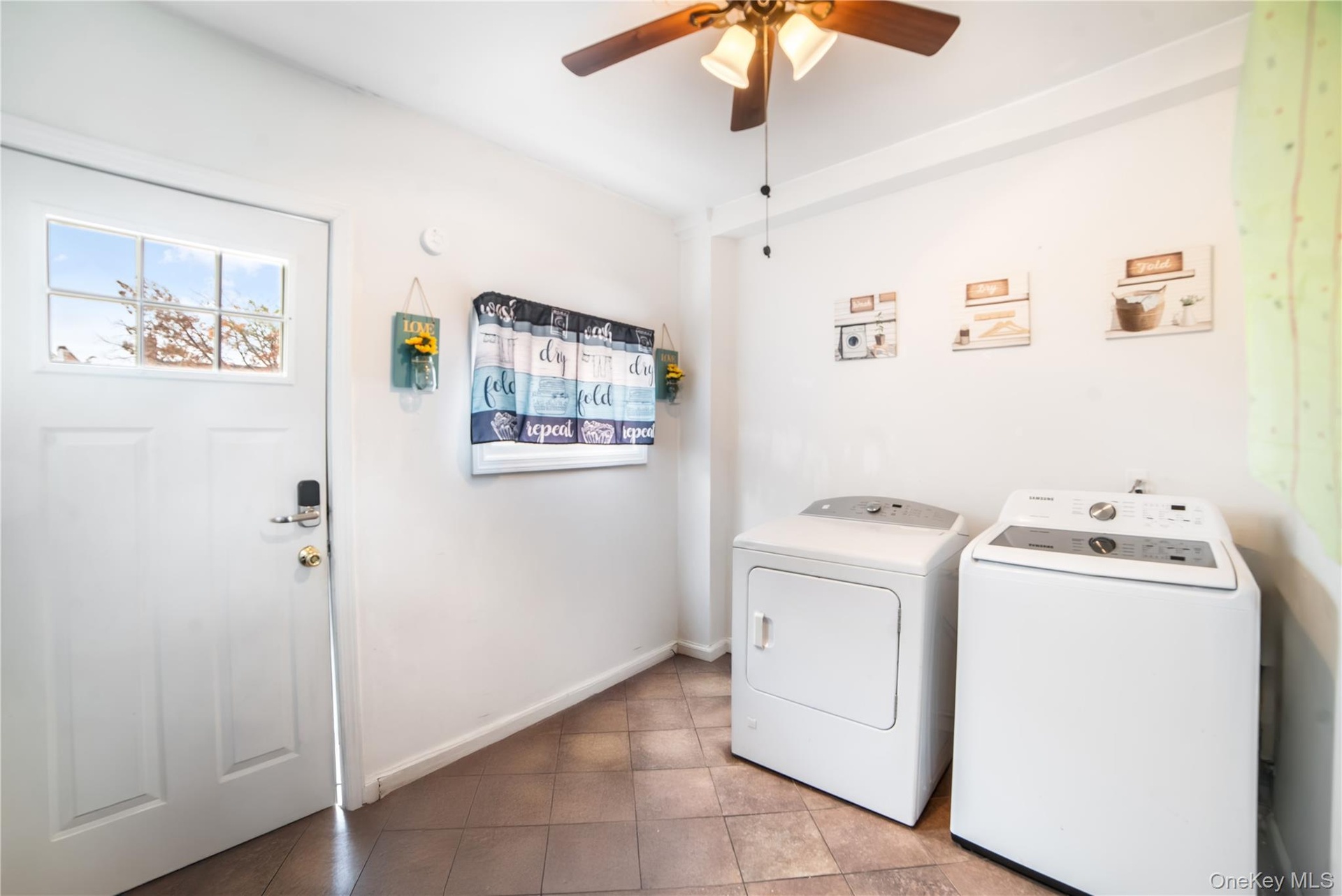 - Washroom featuring washing machine and dryer, ceiling fan, and tile patterned flooring