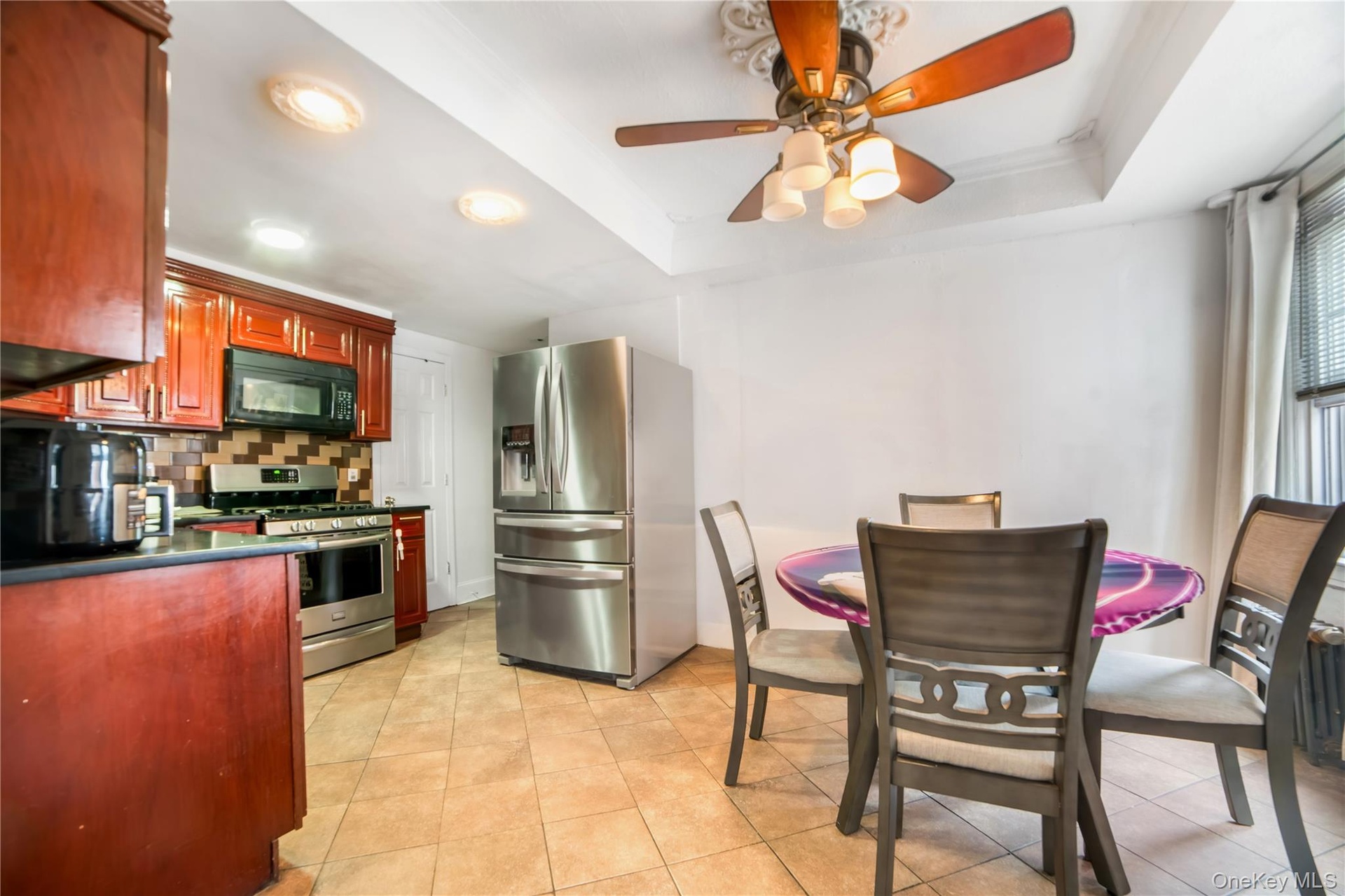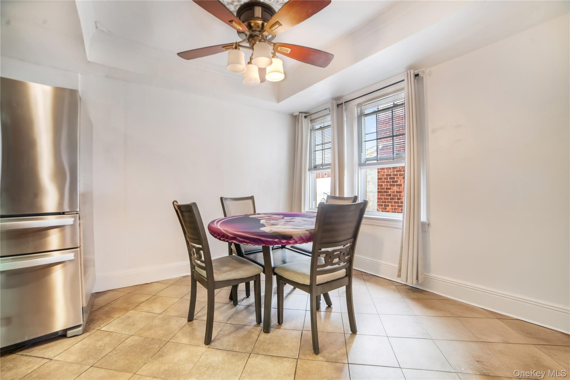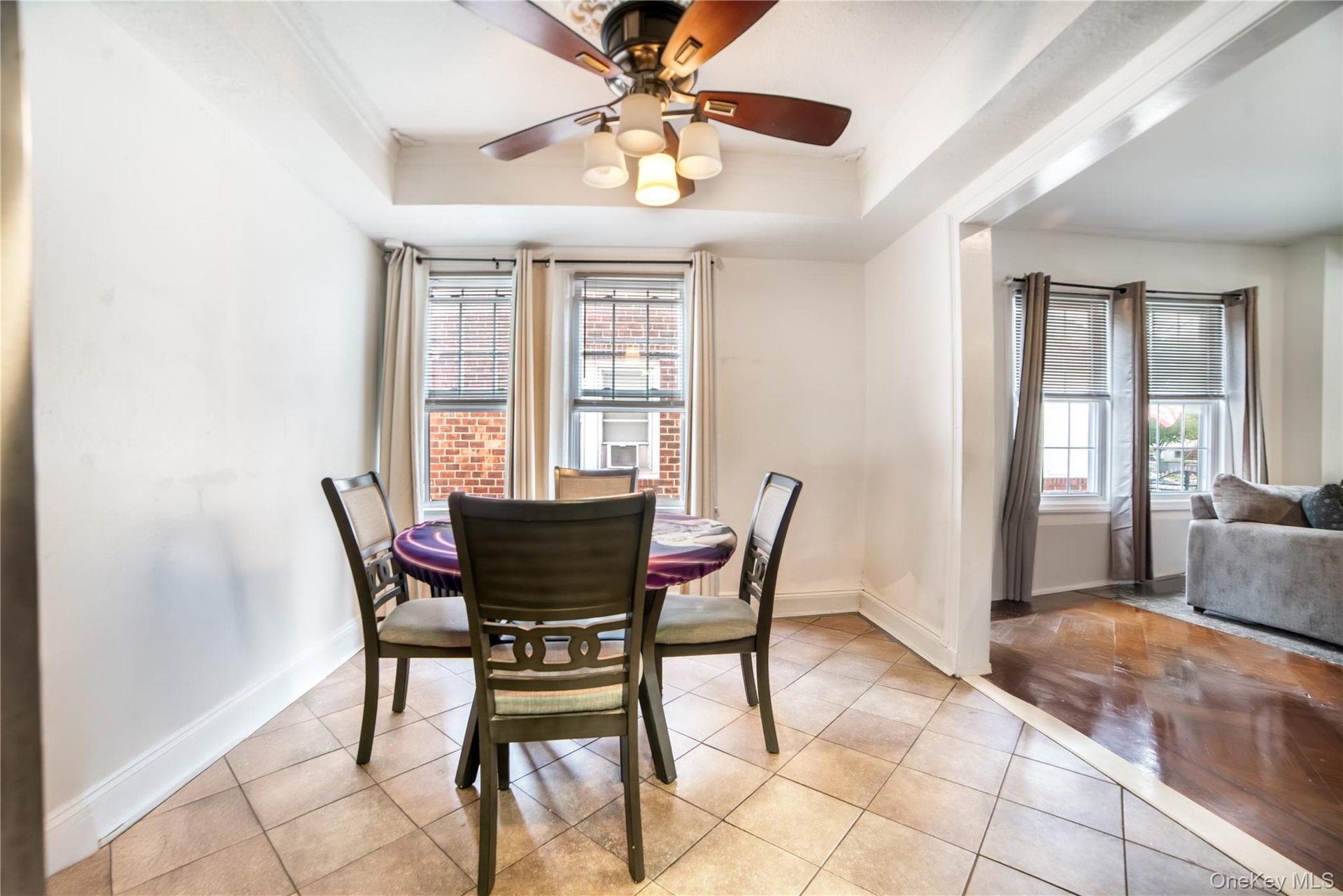 - Dining area featuring a raised ceiling, light tile patterned floors, and a ceiling fan