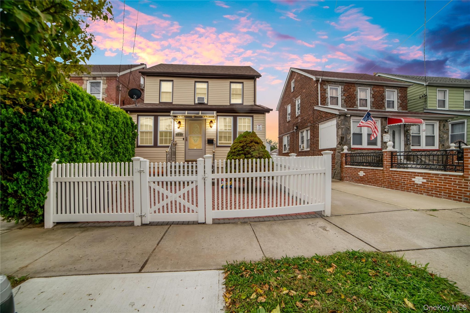 - Traditional-style home featuring a fenced front yard, a gate, a shingled roof, and concrete driveway