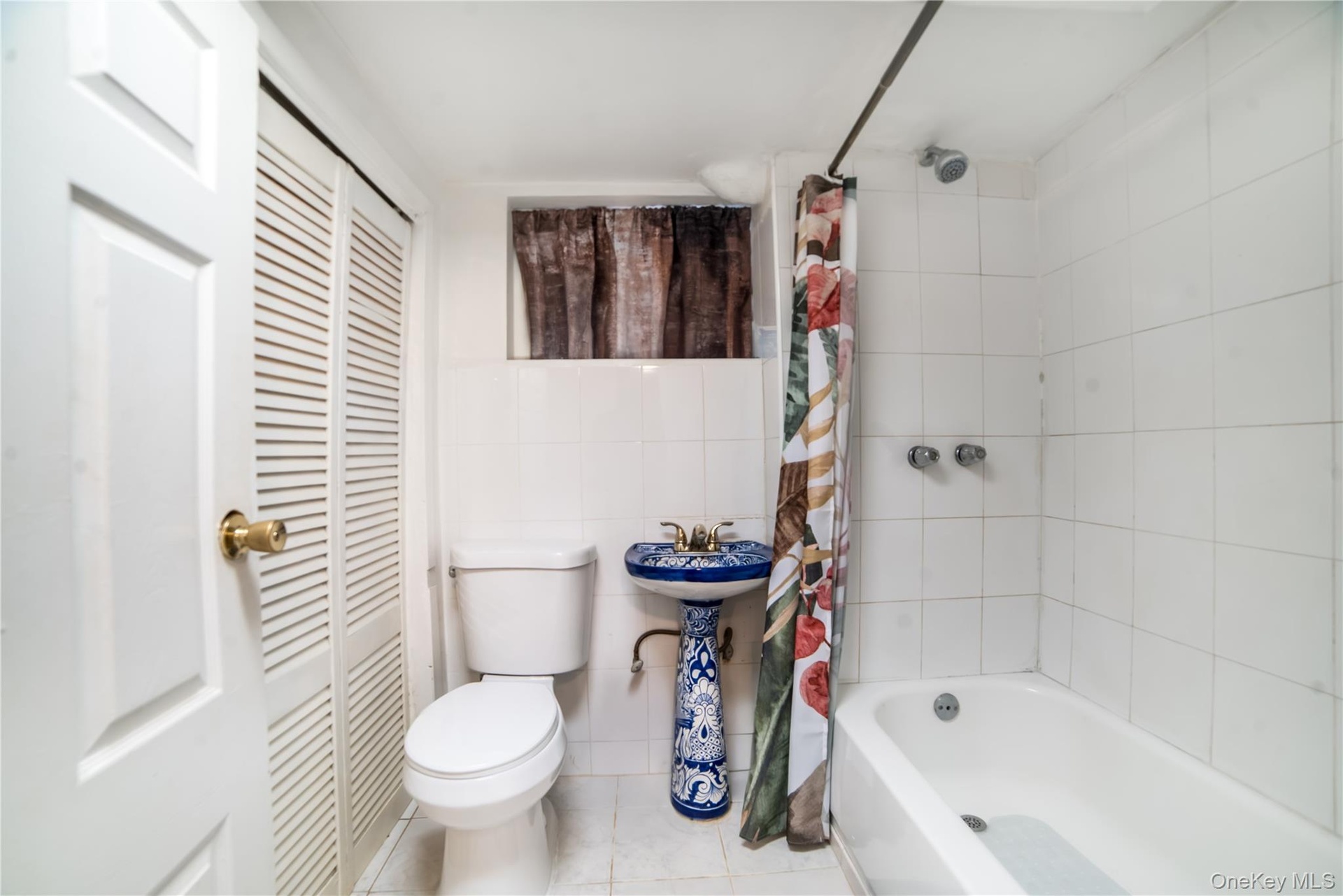 - Bathroom featuring a closet, tile walls, shower / tub combo, and tile patterned flooring