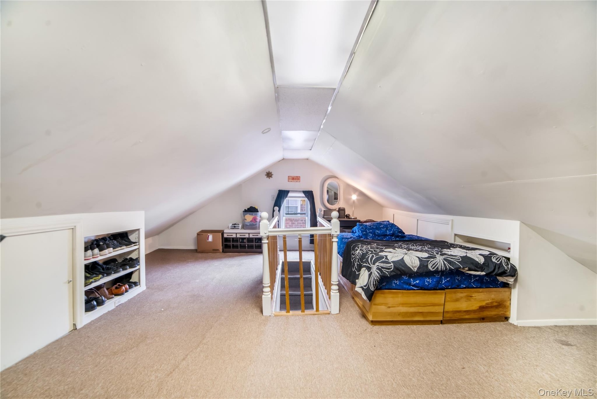 - Bedroom featuring carpet flooring and vaulted ceiling