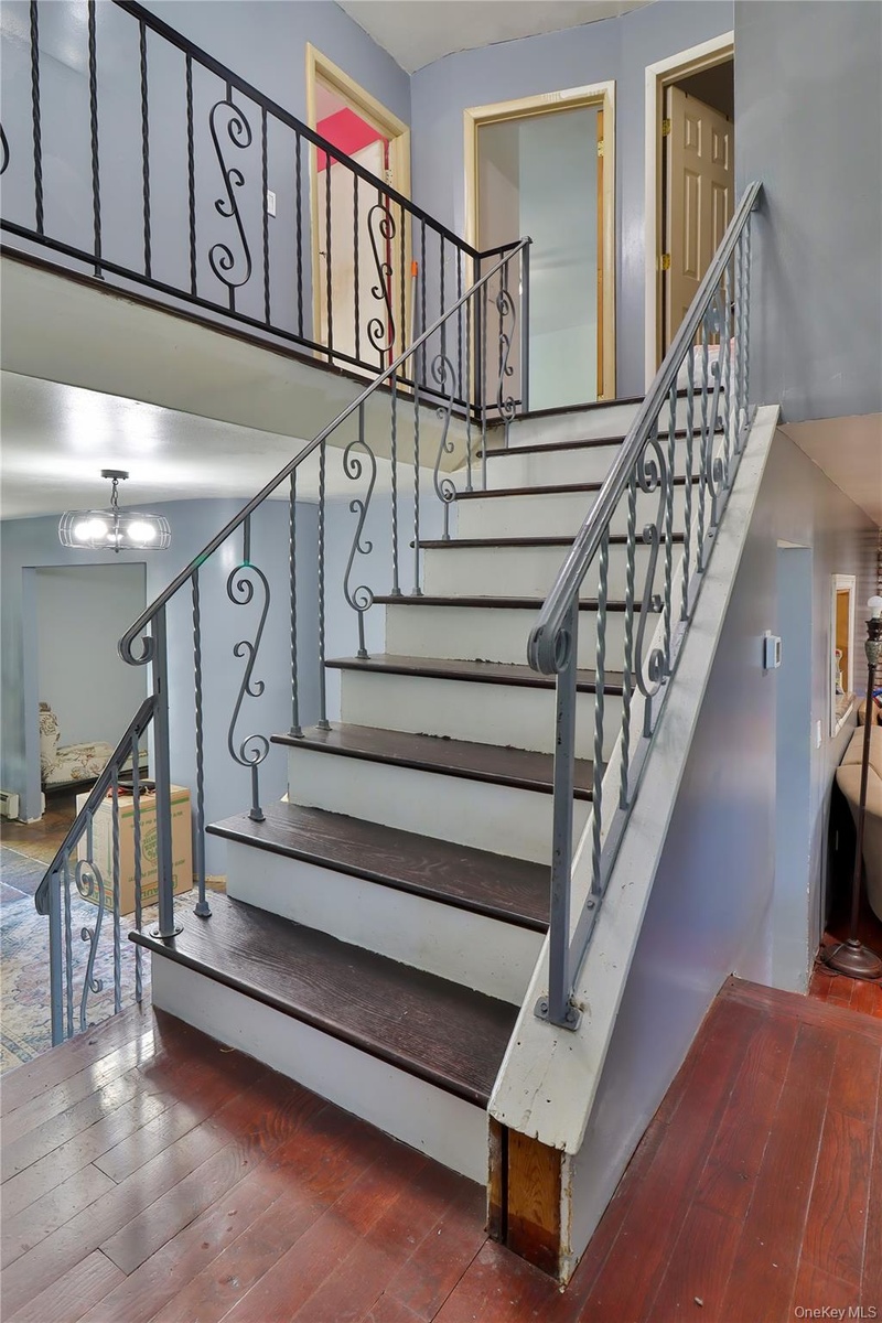 - Stairway featuring hardwood / wood-style floors and a chandelier