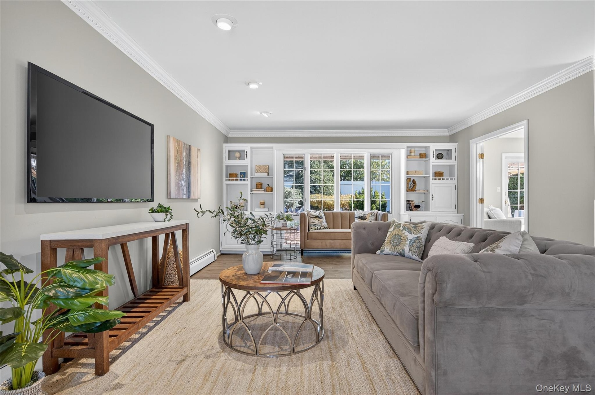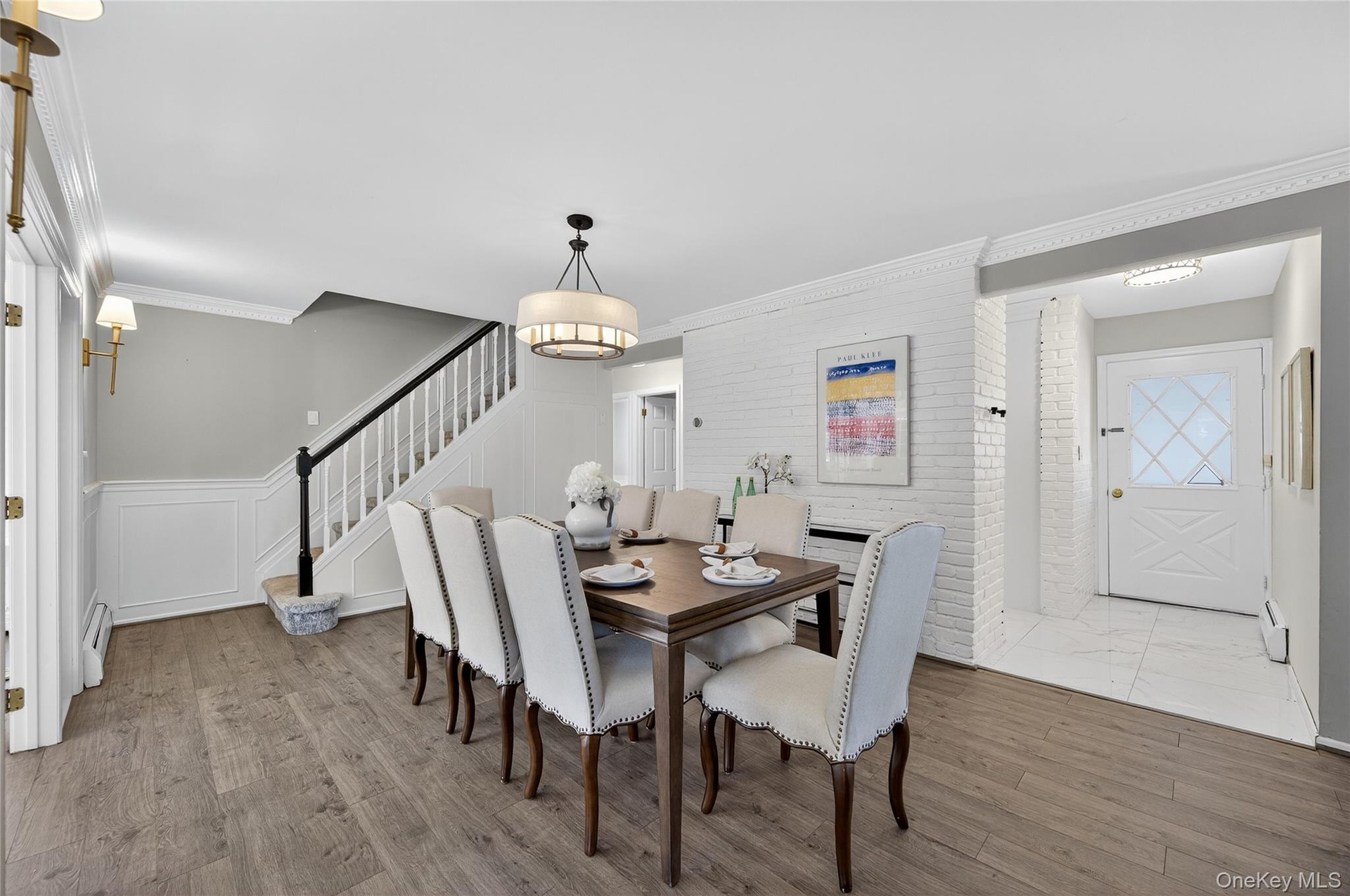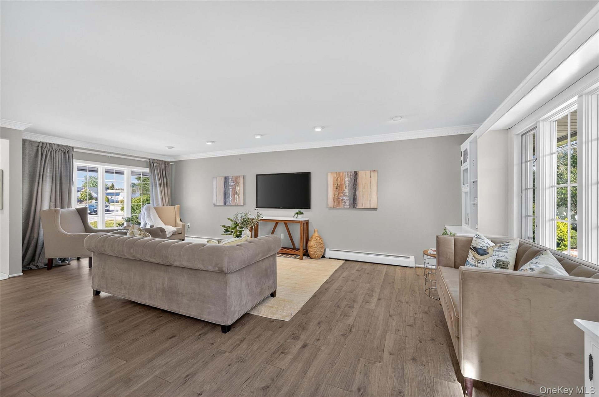 Sun flooded Cape cod style home in East Meadow Schools! Updated and nicely appointed with expanded cape is situated in a lovely neighborhood setting just minutes from extraordinary Eisenhower Park, fabulous shopping, dining and major transportation. The circular drive creates easy parking for owners and guests and the landscaping enhances the home's curb appeal. The entry foyer leads into the front to back living room, with built-in, hi hat lighting, and decorative moldings. The open floor plan is great for entertaining and the formal dining room opens to the the skylit den and sliders on out to the private backyard. There is an updated kitchen with stainless steel appliances, stone counters and backsplash, lots of cabinetry and double sink. There are 2 bedrooms on this level and a updated full bath and upstairs are three bedrooms and another updated bath. Additional features include neutral decor, tile flooring, hardwood floors, updated windows, great light throughout, private, fenced yard with brick patio and lush landscaping. A must see!