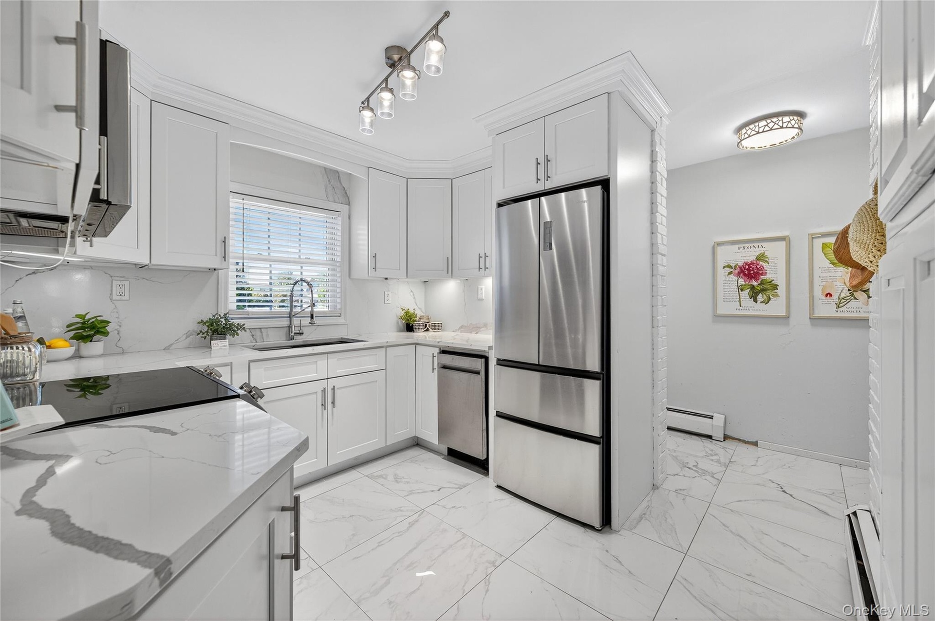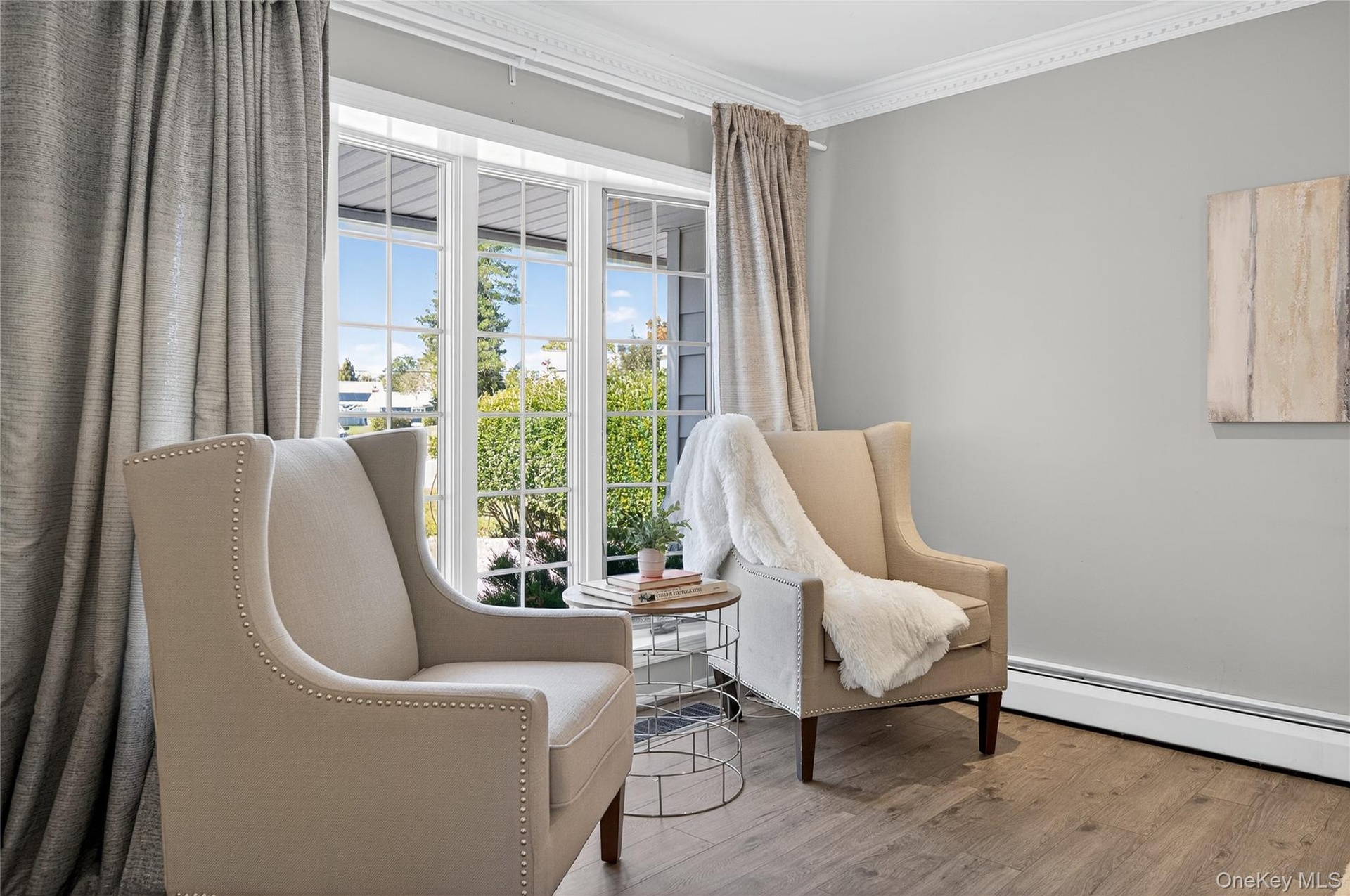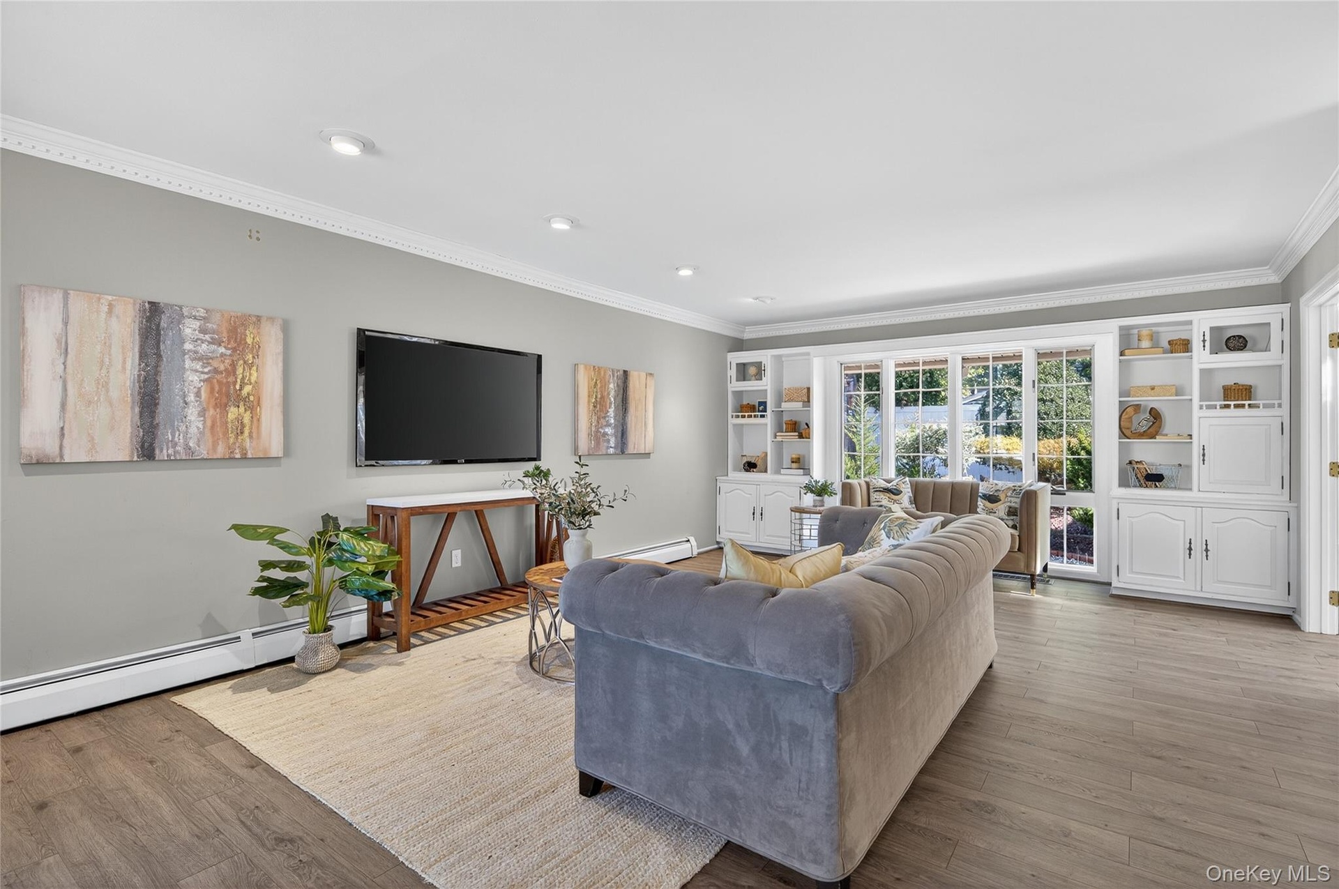 Sun flooded Cape cod style home in East Meadow Schools! Updated and nicely appointed with expanded cape is situated in a lovely neighborhood setting just minutes from extraordinary Eisenhower Park, fabulous shopping, dining and major transportation. The circular drive creates easy parking for owners and guests and the landscaping enhances the home's curb appeal. The entry foyer leads into the front to back living room, with built-in, hi hat lighting, and decorative moldings. The open floor plan is great for entertaining and the formal dining room opens to the the skylit den and sliders on out to the private backyard. There is an updated kitchen with stainless steel appliances, stone counters and backsplash, lots of cabinetry and double sink. There are 2 bedrooms on this level and a updated full bath and upstairs are three bedrooms and another updated bath. Additional features include neutral decor, tile flooring, hardwood floors, updated windows, great light throughout, private, fenced yard with brick patio and lush landscaping. A must see!