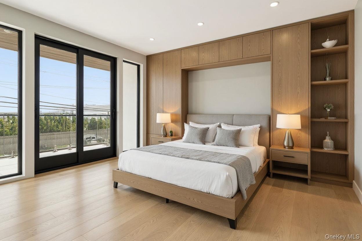 - Bedroom featuring light wood finished floors, recessed lighting, and access to exterior