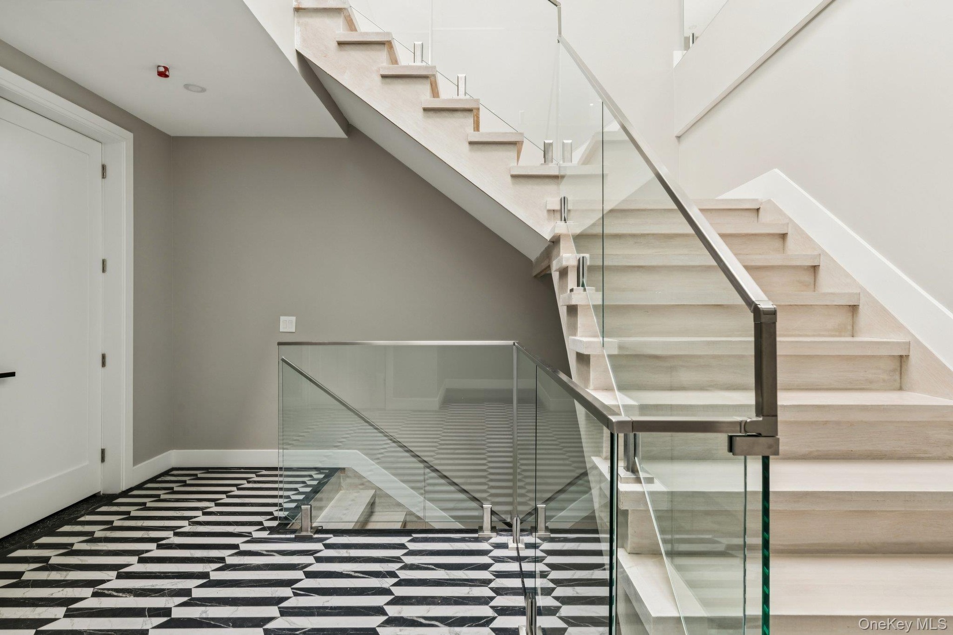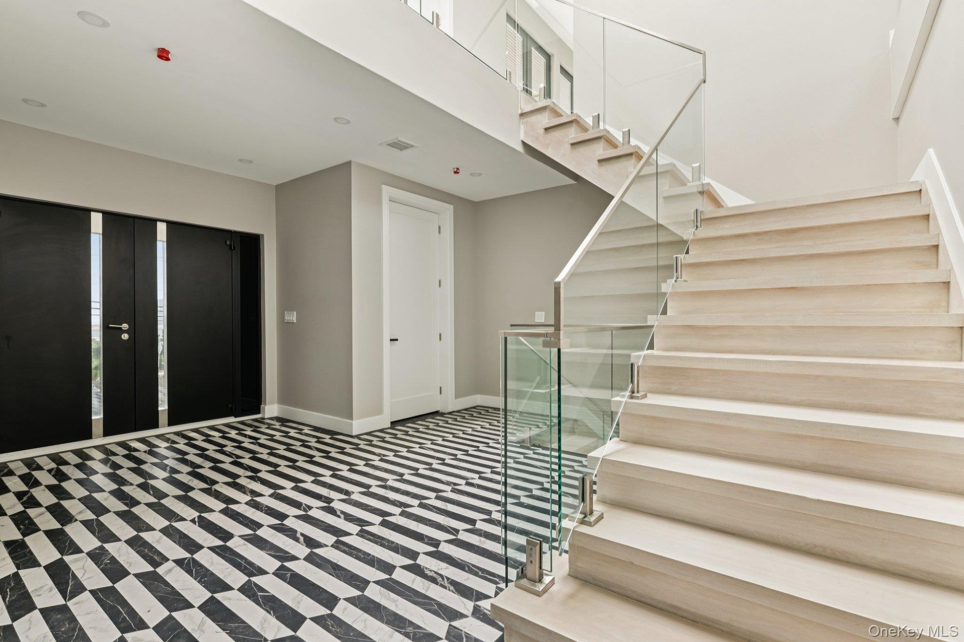 Step into a modern masterpiece designed for seamless living and effortless entertaining, all set against the backdrop of sweeping ocean views! The journey begins in the entryway, where Bisazza marble tiles from the Marmo Collection set a contemporary tone, complemented by a modern staircase with a standoff glass railing system.