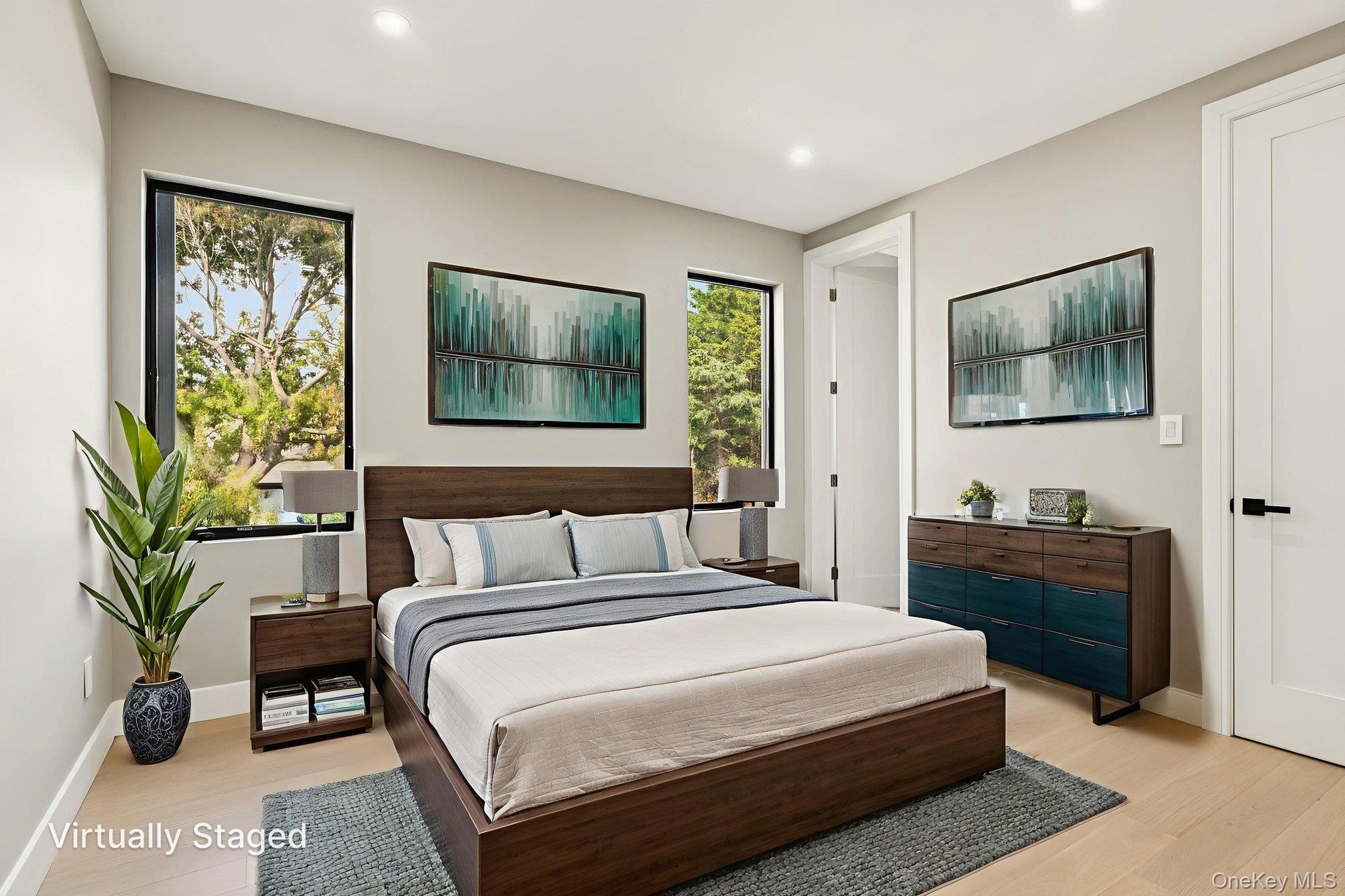 - Bedroom featuring multiple windows, recessed lighting, and light wood finished floors