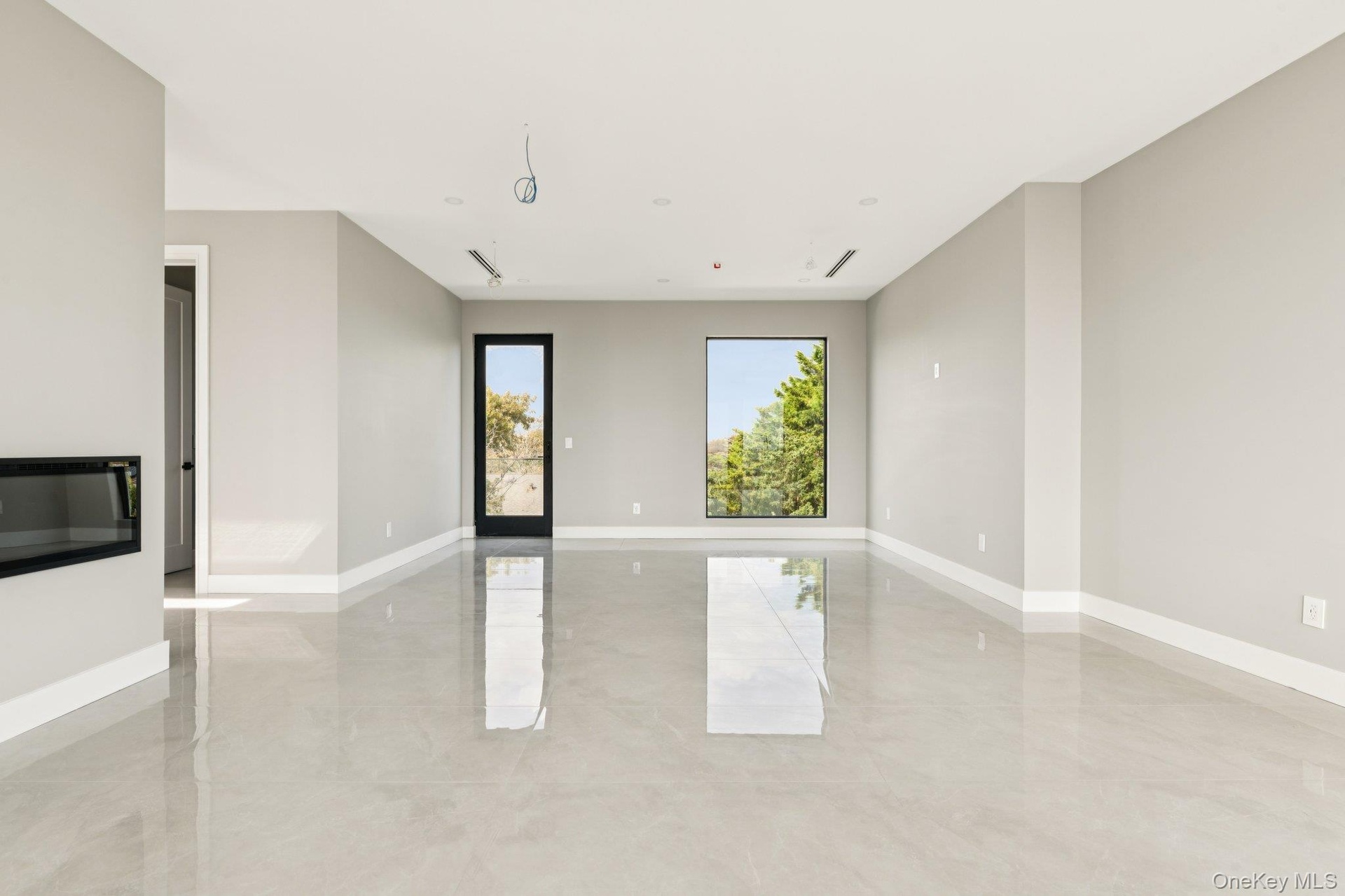 - Unfurnished living room featuring light tile patterned floors and a glass covered fireplace