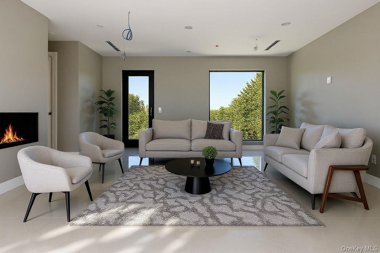- Living room featuring a warm lit fireplace and light tile patterned floors