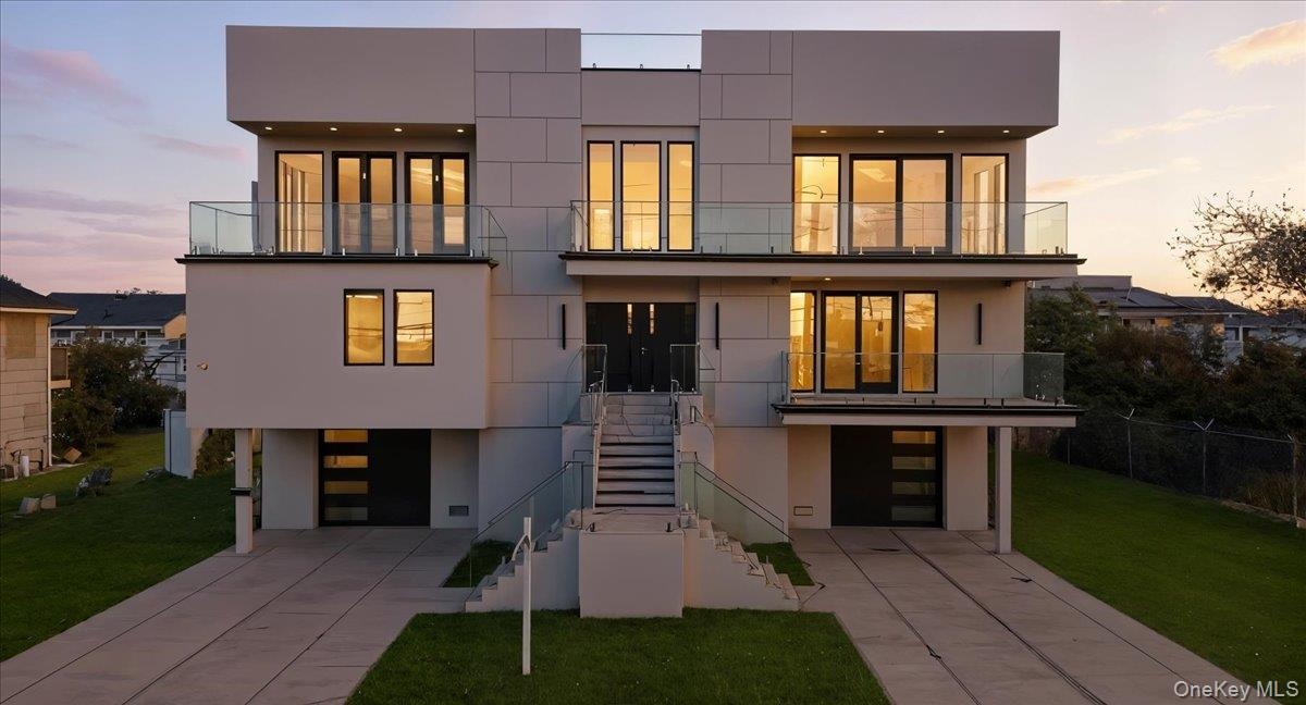 - Contemporary house with stairs, a balcony, stucco siding, and concrete driveway
