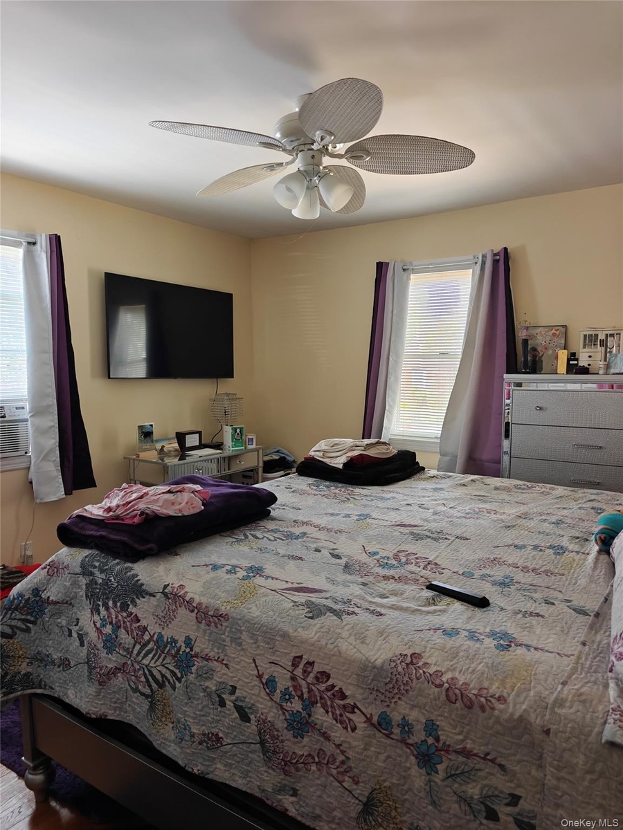 - Bedroom with ceiling fan and multiple windows