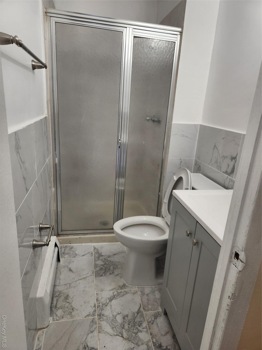 - Full bathroom featuring tile walls, wainscoting, vanity, light marble finish floors, and a stall shower