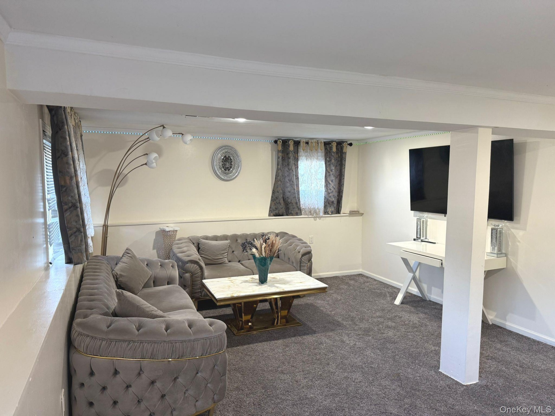 - Living room with carpet flooring and crown molding