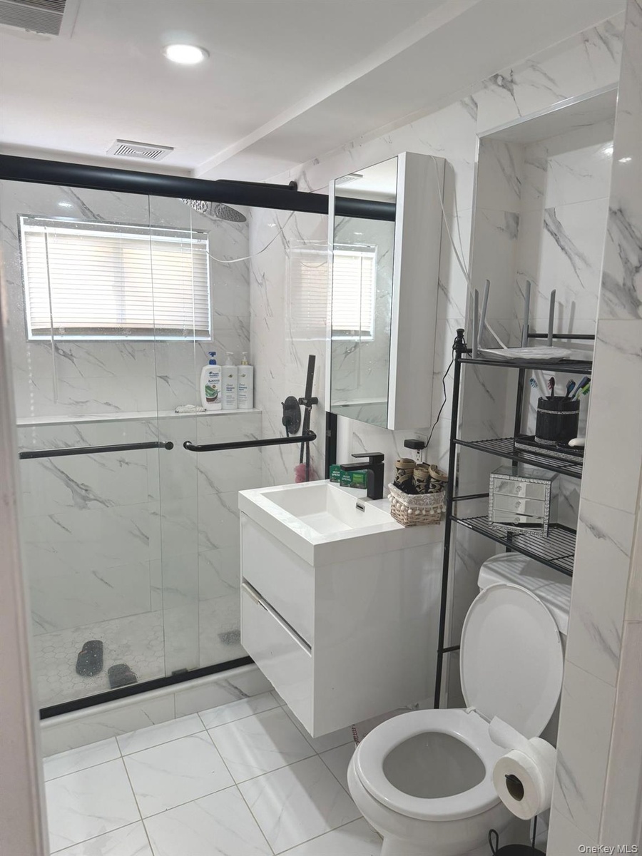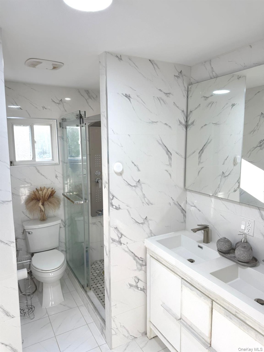 - Bathroom with vanity, a marble finish shower, plenty of natural light, and tile walls
