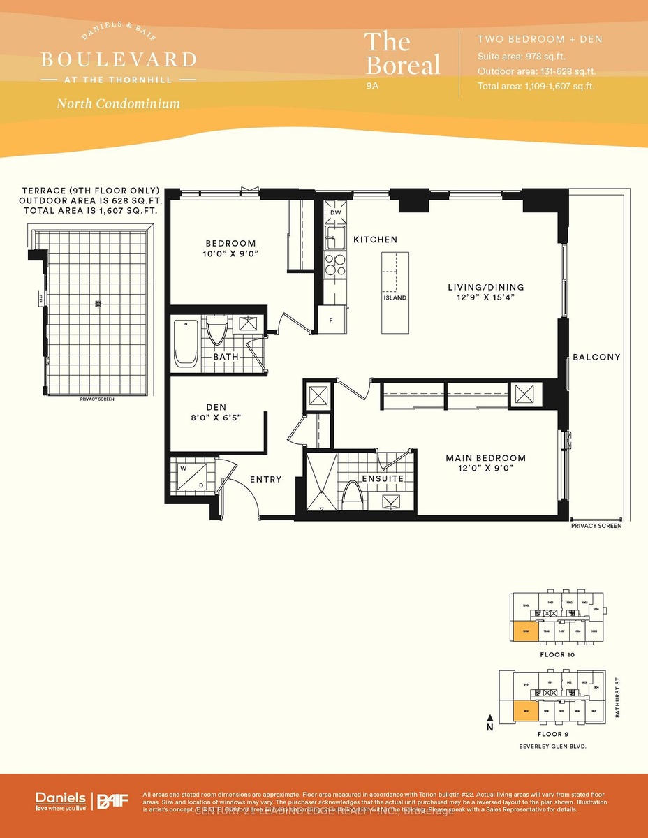 Welcome to Unit 909 The Boreal, a standout 2-bedroom + den corner suite offering 978 sf of bright, refined interior space and a massive 628 sf southwest-facing terrace. Exclusive to the 9th floor, this outdoor oasis delivers all-day sun and unobstructed views, perfect for relaxing or entertaining.This suite has been thoughtfully upgraded with over $14,000 in enhancements, including solid core interior doors for superior soundproofing and a premium feel. The interior features wide-plank engineered hardwood flooring, and a showpiece kitchen with custom cabinetry, quartz countertops, under-cabinet lighting, modern backsplash, and a sleek central island.Floor-to-ceiling windows flood the open-concept living space with sunlight. The primary bedroom includes a built-in closet and access to a stylish ensuite. A second bedroom and a flexible den add versatility. This home also includes two EV-ready parking spots and a locker for added convenience.Residents enjoy top-tier amenities: party room with terrace, yoga & fitness zones, coworking lounges, pet wash station, greenhouse, garden plots, calisthenics area, basketball court, and a dedicated dog run.Located steps from Promenade Mall, parks, cafes, top schools, transit, and minutes to VIVA, Langstaff GO, and major highways, Unit 909 delivers luxury, space, and sunlight in the heart of South Vaughan.