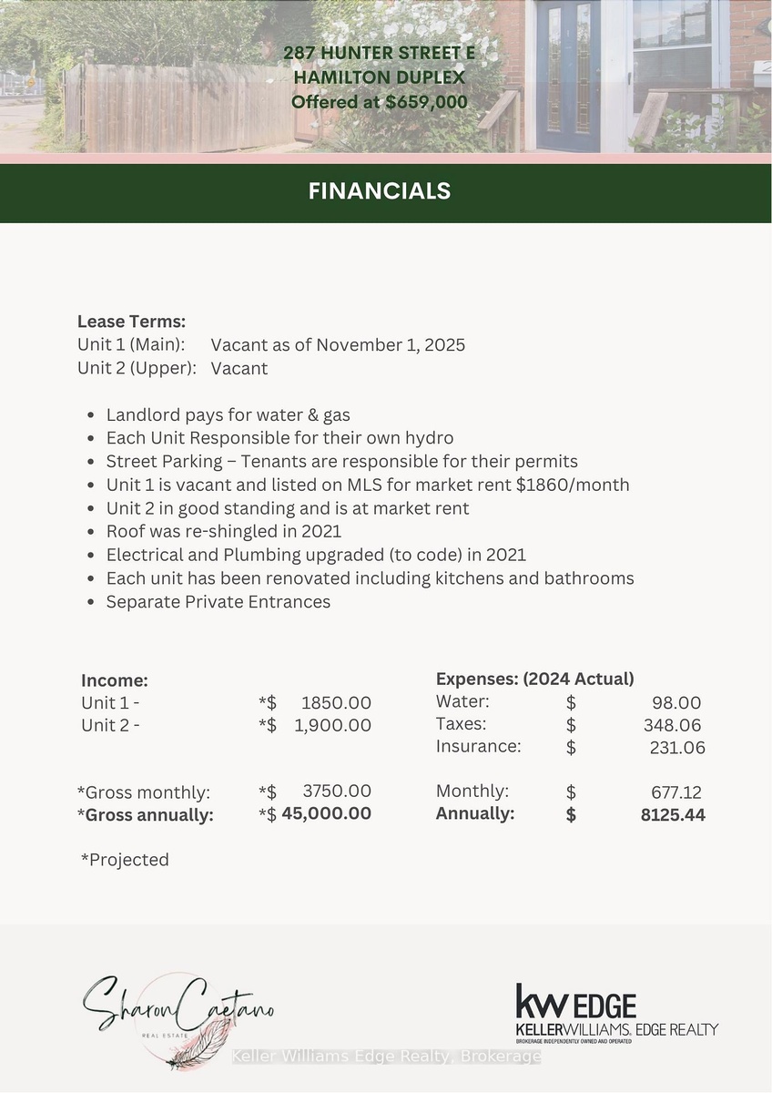 DescriptionPrime Legal Duplex Investment Opportunity on a quiet dead-end street in Hamilton. Currently turning over tenants - ***For a limited time only... Take advantage of a vacant property!*** Unit 1 (Main floor/Basement) is 1+1 bed/ 1 bath. Unit 2 (Second/Third floors) is 2 bed /1 bath with access to private backyard. Substantial upgrades in 2021: New Roof, Electrical and Plumbing, as well as full kitchen, baths & flooring. Each unit has separate private entrance, in-suite full size laundry, dishwasher, and walking distance to all amenities. Located in a quietly gentrifying area of Hamilton. This vibrant City still has room for potential growth in value! Investors package available.Amenities- Deck