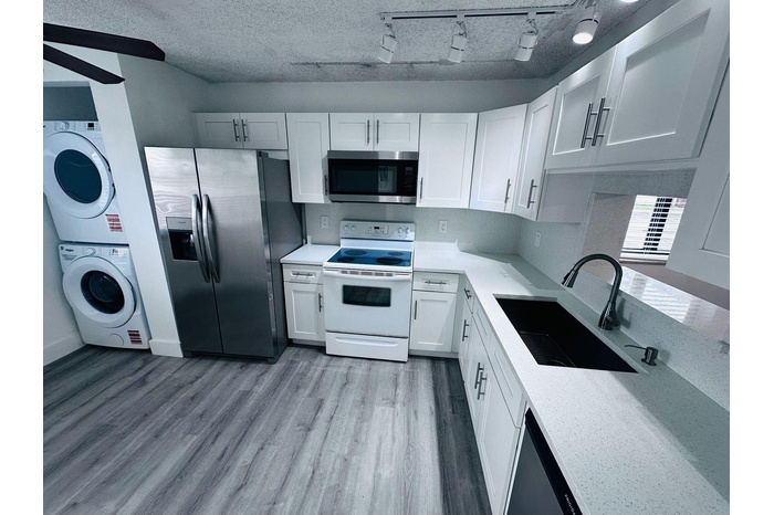 Beautifully updated and truly move-in ready! This home features custom closet organizers in the master and guest bedroom closets, laundry hall, and pantry. Enjoy a stunning new kitchen with modern cabinets, quartz countertops, a farmhouse sink, and upgraded faucet. Comes complete with new appliances - refrigerator, dishwasher, washer, and dryer.Additional upgrades include new central air, new air handler, and complete duct cleaning. Both bathrooms are fully renovated with sleek finishes and glass shower doors. Stylish waterproof luxury vinyl flooring throughout - no tile or carpet.Other highlights: Dade County-approved hurricane impact windows, new blinds and verticals, and a freshly painted interior. A perfect blend of style, comfort, and convenience!