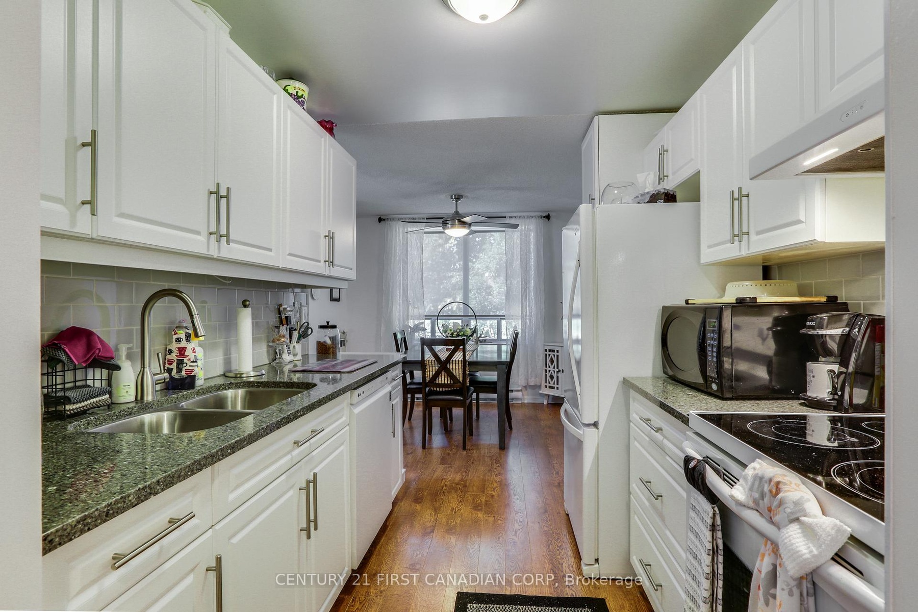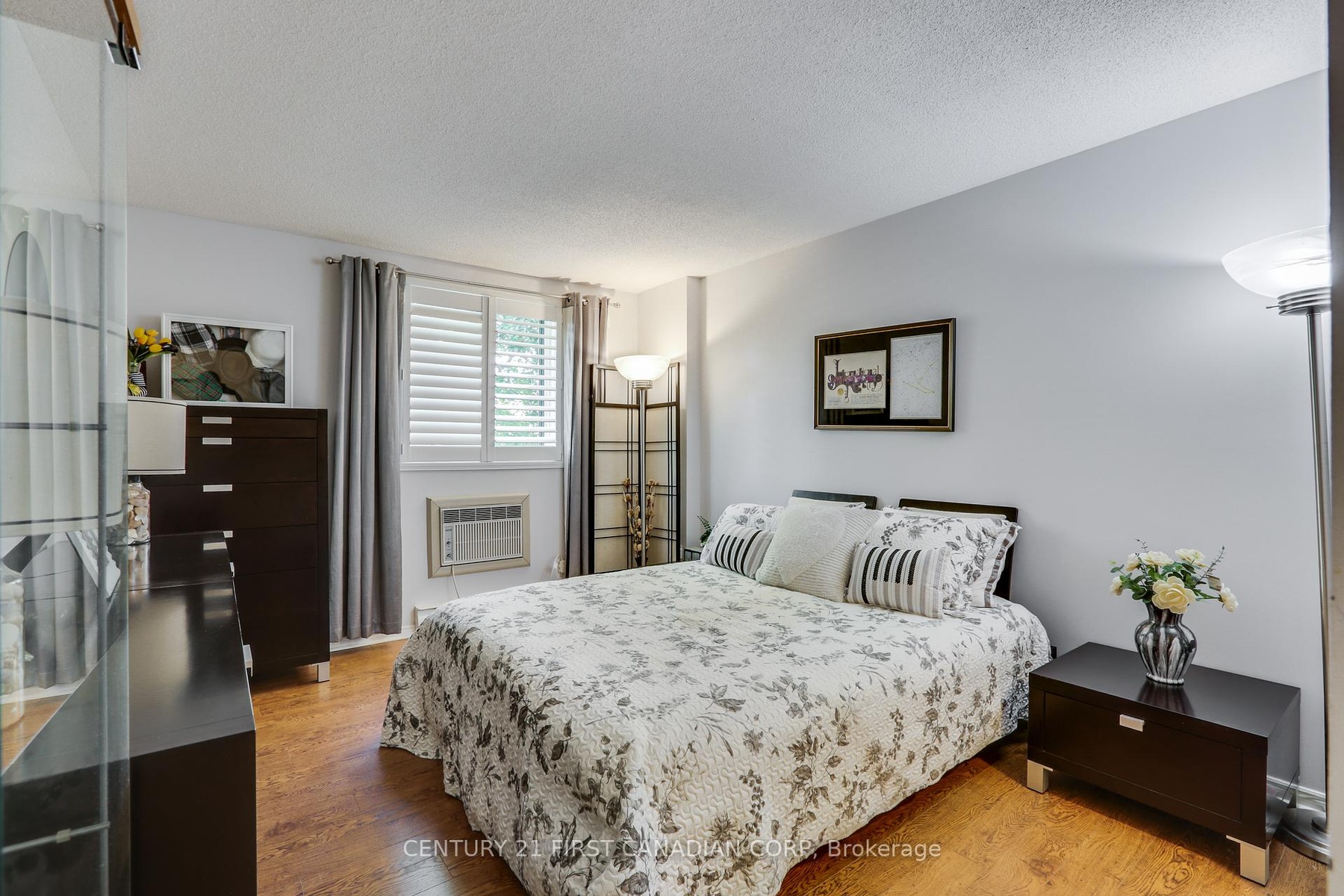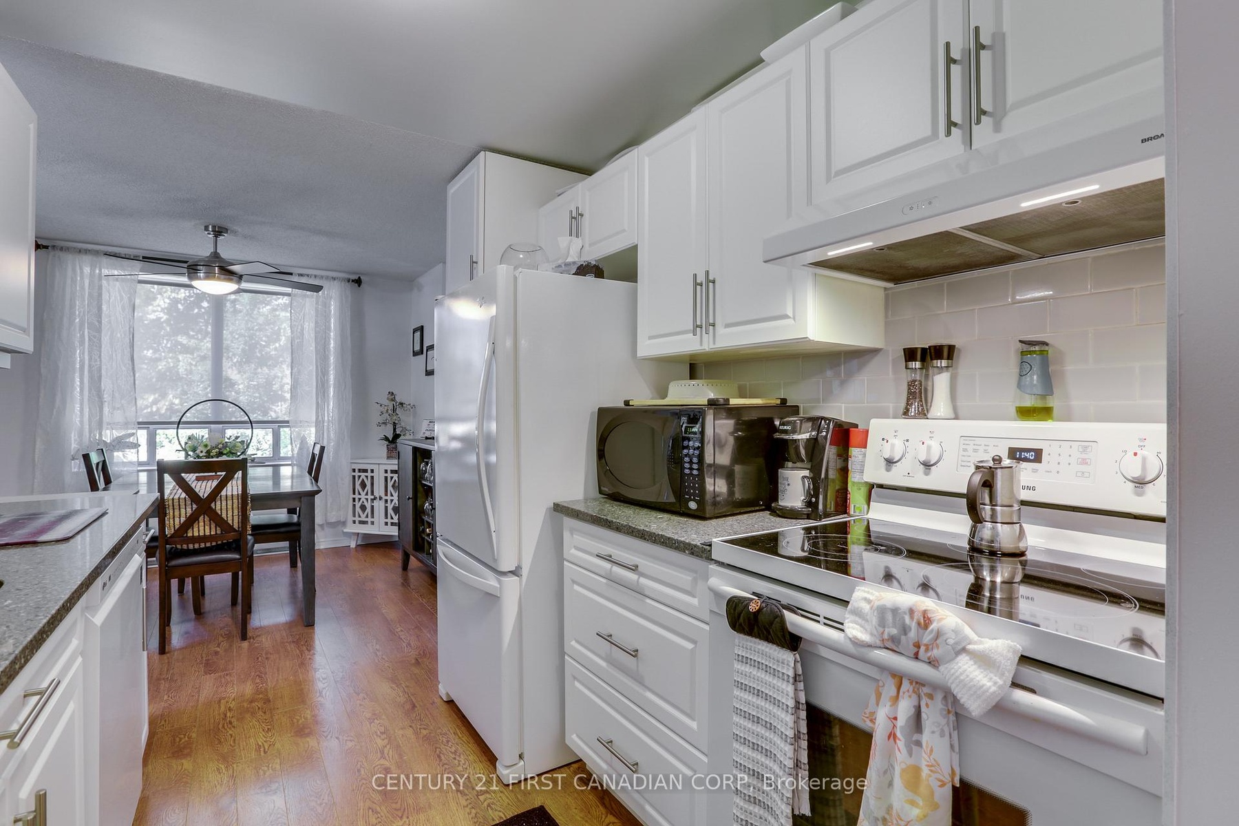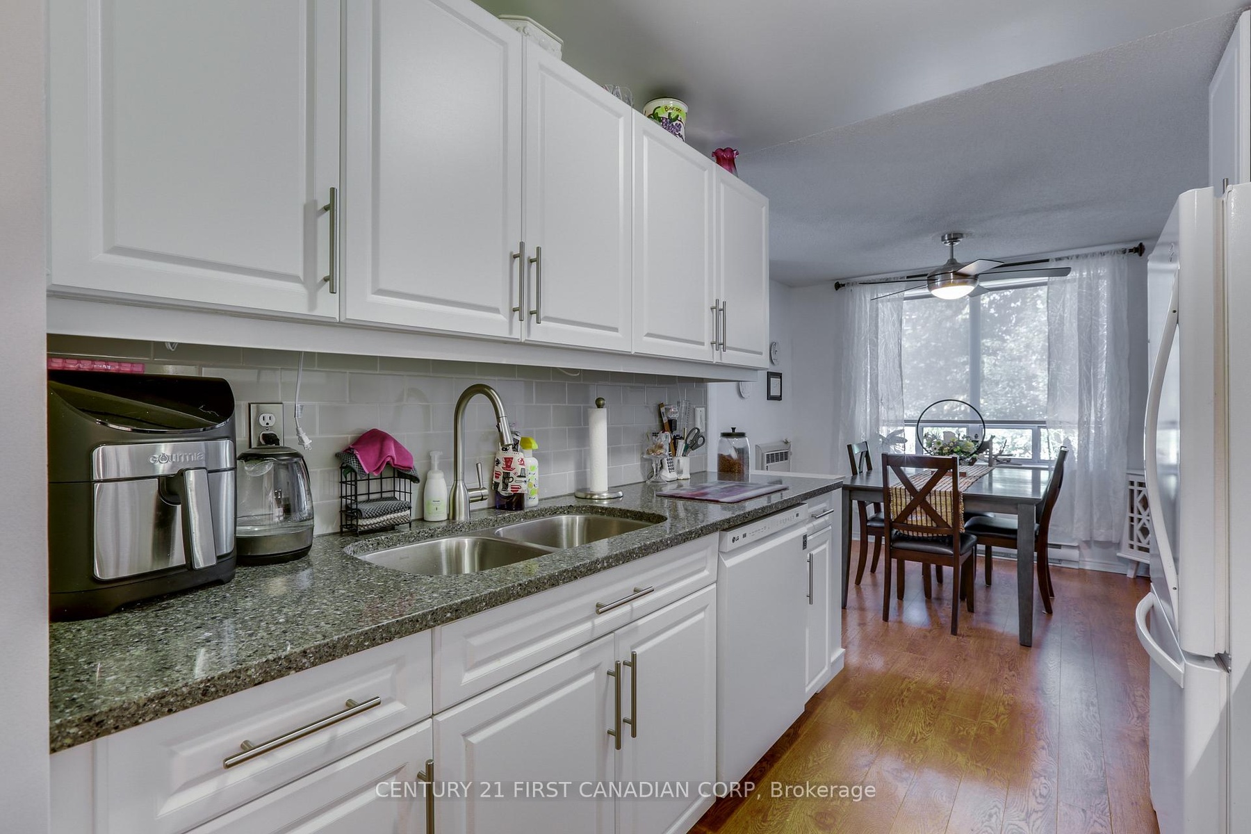 Turn-key 2-bedroom, 2-bathroom, corner unit condo in South London, Ontario! Welcome to this beautifully maintained second-floor condo corner unit at 201-76 Base Line Rd. W. Bright and inviting with a large bay window and loads of natural light, this carpet-free home offers plenty of upgrades throughout. The kitchen features refaced cabinetry, quartz countertops, a stylish backsplash, soft-close cupboards, and a custom pantry. Both bathrooms were updated in 23' with modern vanities, while the unit also boasts new laminate flooring 20'. Custom built-in storage with sleek sliding doors is found in the foyer and along the full width of the living room, adding both function and style. California shutters added in 23' in the bedrooms and patio door further enhance the space. Step out to a generous private balcony to enjoy the outdoors! The spacious primary suite offers a walk-in closet and ensuite, while convenient in-suite laundry is located in the main hallway. Building amenities include an exercise room, sauna, controlled entry, and plenty of parking. Fantastic location close to shopping, restaurants, parks, public transit, and so much more! Book your showing today!