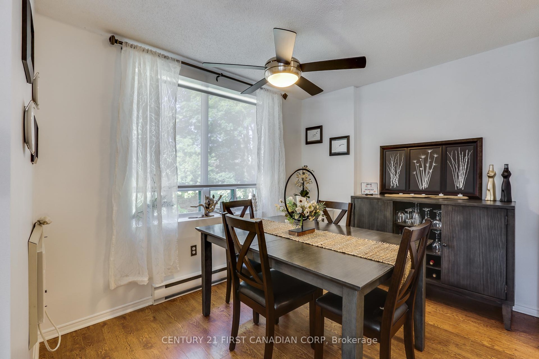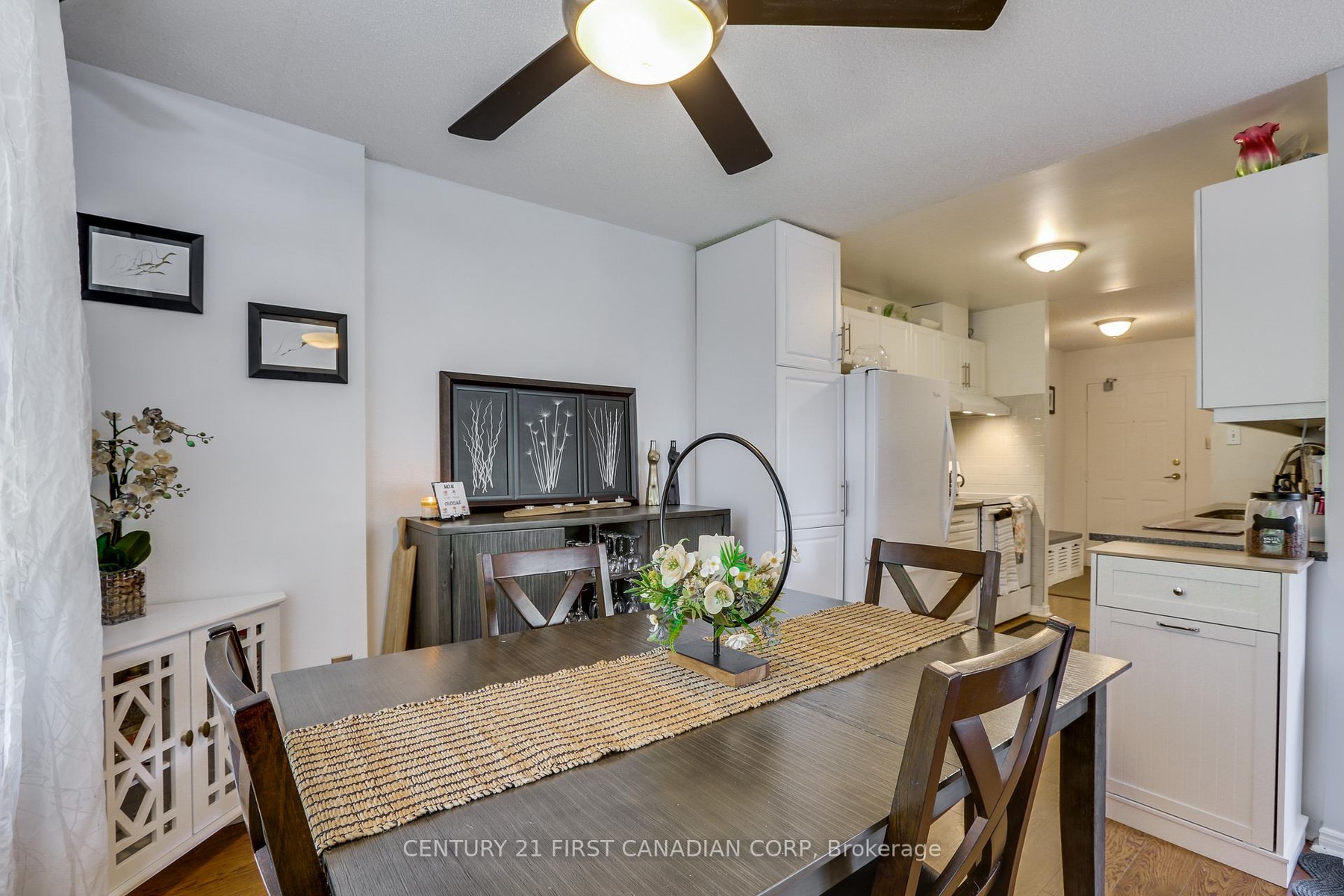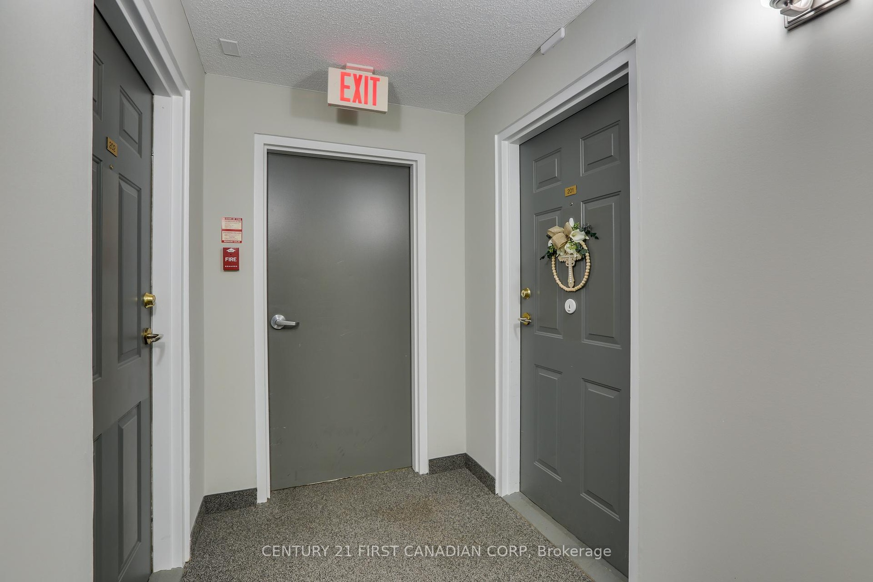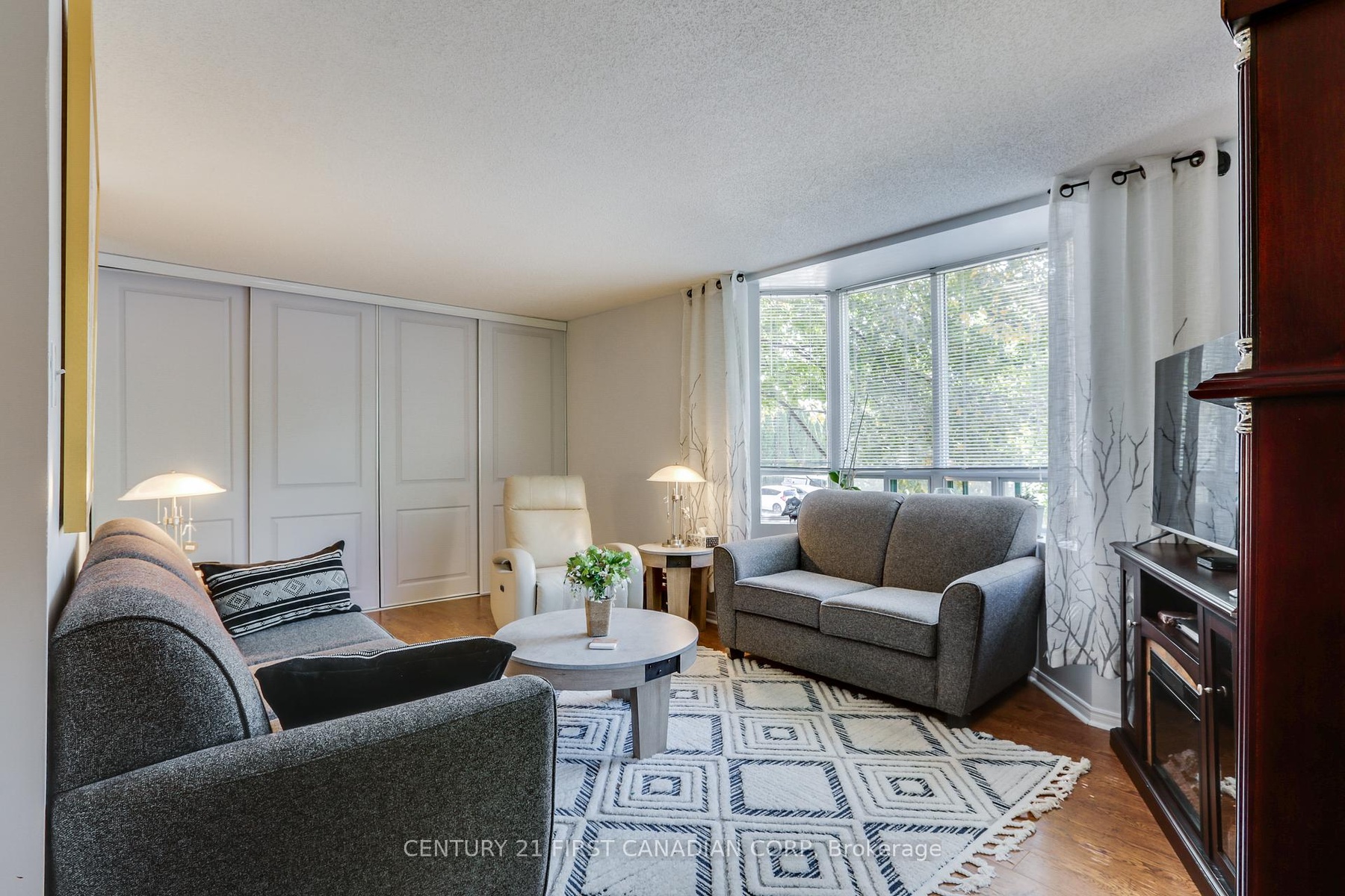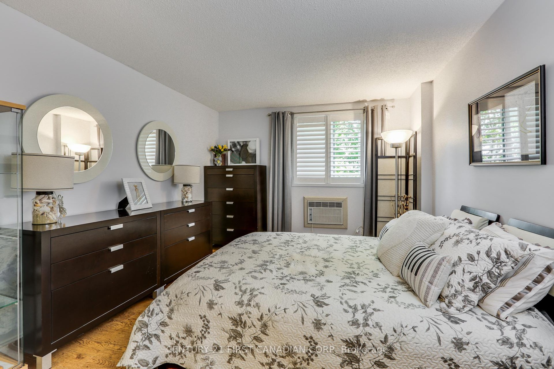 Turn-key 2-bedroom, 2-bathroom, corner unit condo in South London, Ontario! Welcome to this beautifully maintained second-floor condo corner unit at 201-76 Base Line Rd. W. Bright and inviting with a large bay window and loads of natural light, this carpet-free home offers plenty of upgrades throughout. The kitchen features refaced cabinetry, quartz countertops, a stylish backsplash, soft-close cupboards, and a custom pantry. Both bathrooms were updated in 23' with modern vanities, while the unit also boasts new laminate flooring 20'. Custom built-in storage with sleek sliding doors is found in the foyer and along the full width of the living room, adding both function and style. California shutters added in 23' in the bedrooms and patio door further enhance the space. Step out to a generous private balcony to enjoy the outdoors! The spacious primary suite offers a walk-in closet and ensuite, while convenient in-suite laundry is located in the main hallway. Building amenities include an exercise room, sauna, controlled entry, and plenty of parking. Fantastic location close to shopping, restaurants, parks, public transit, and so much more! Book your showing today!